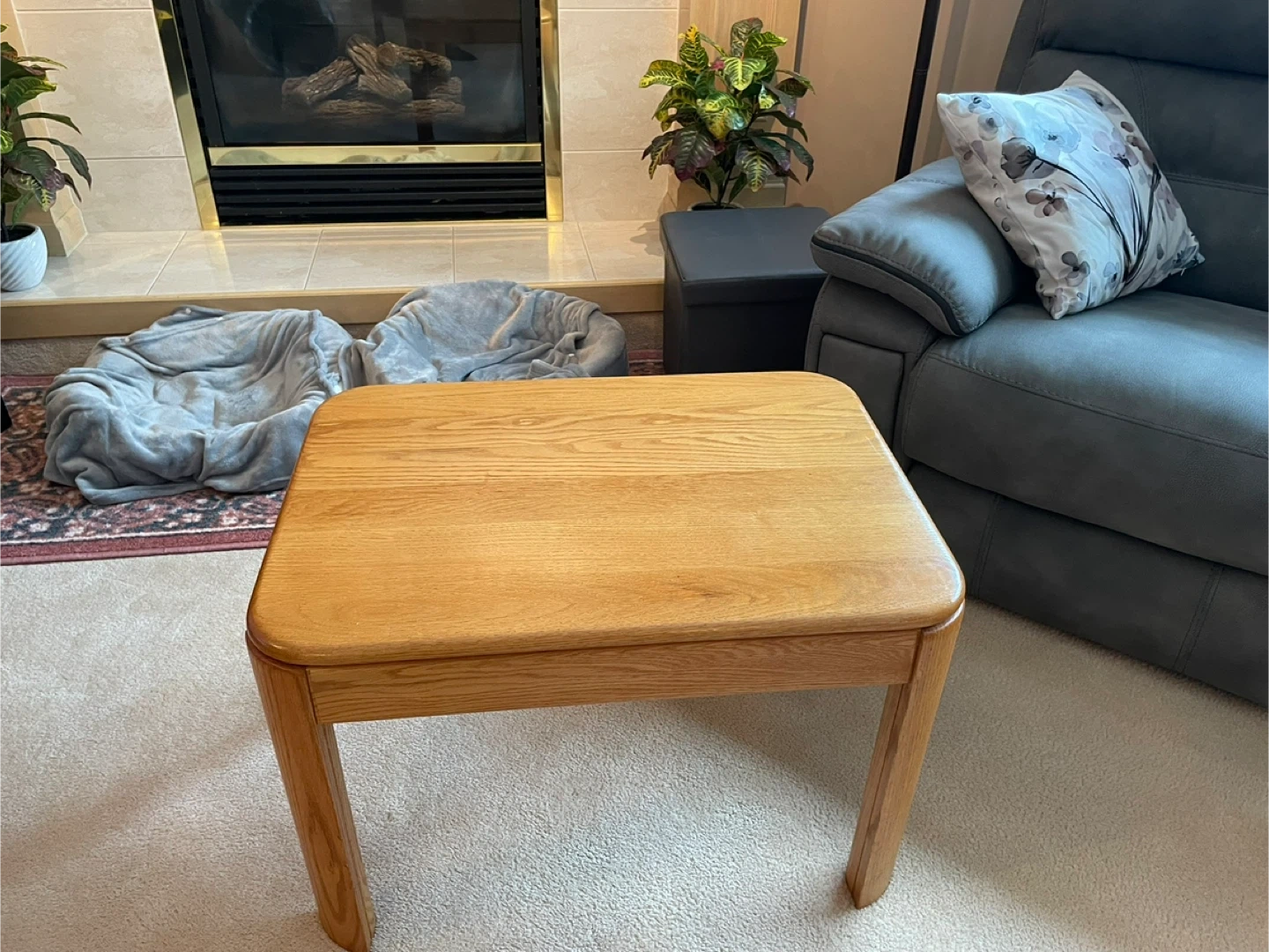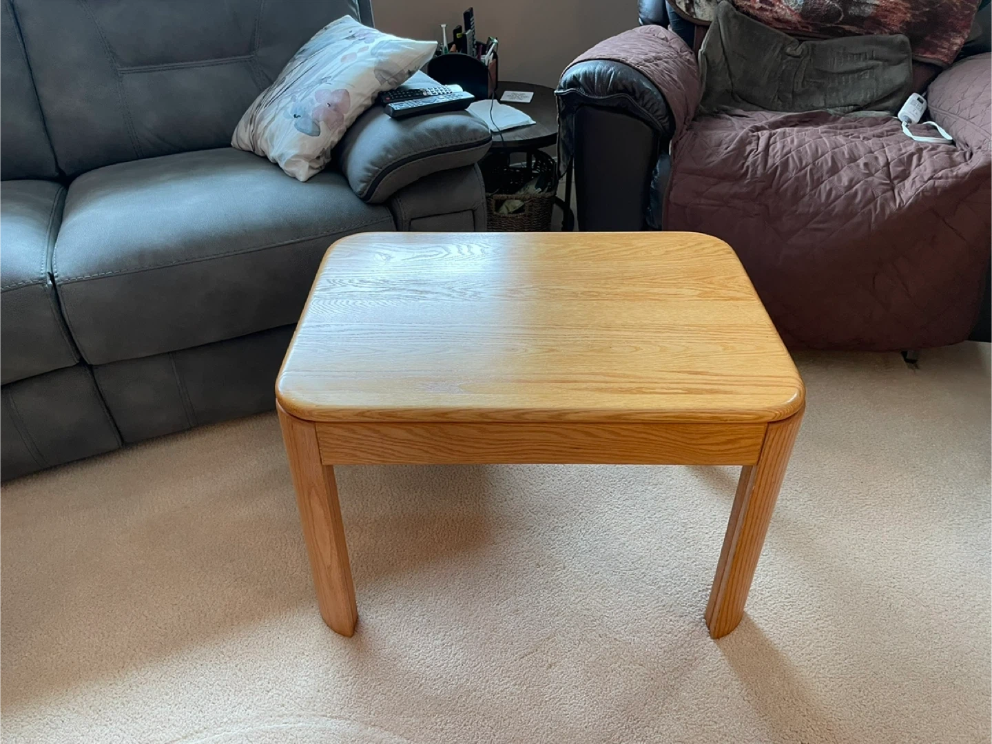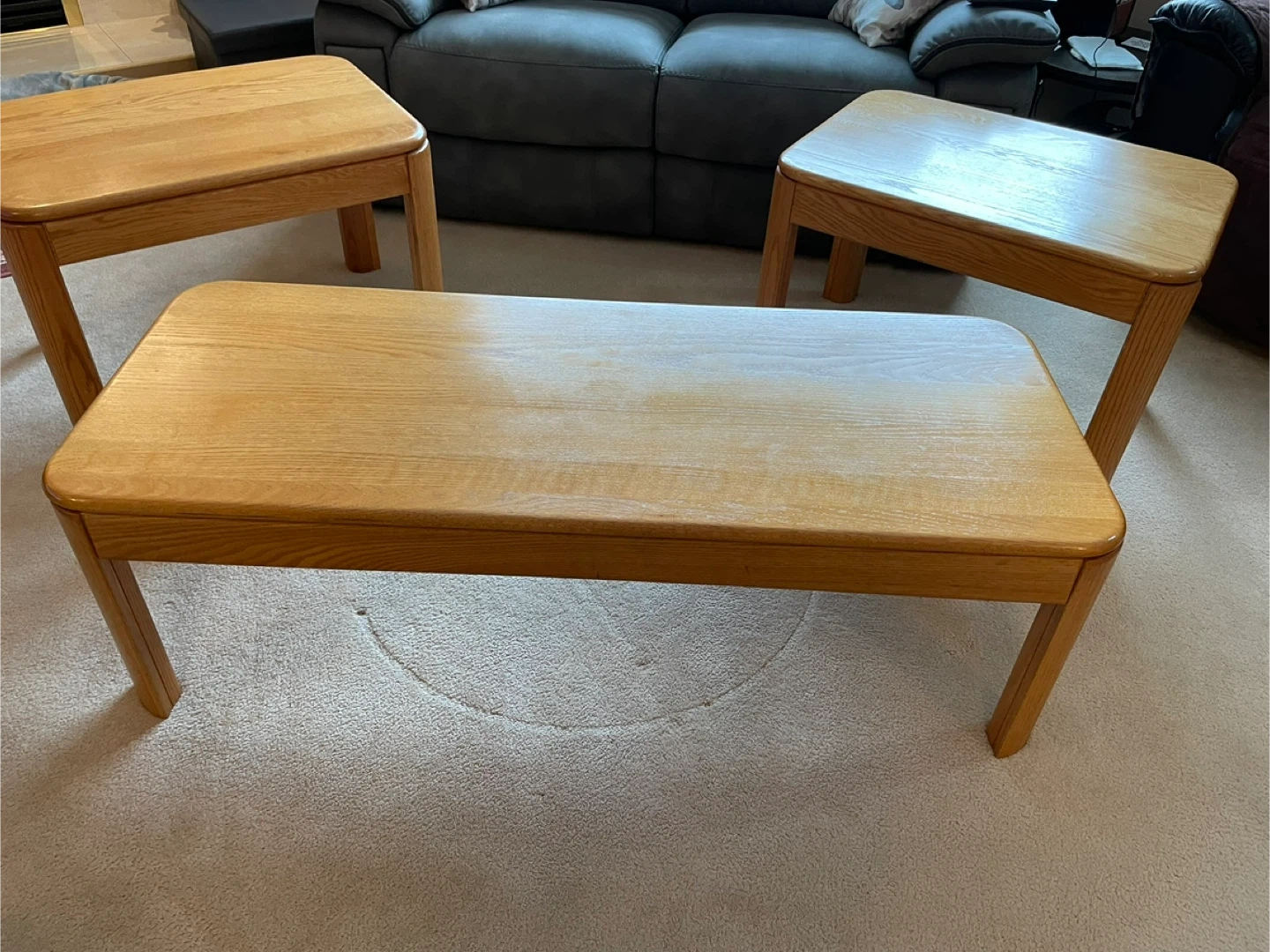 This set includes a coffee table and two end tables, all made of oak. The wood has a warm, natural finish. These tables are sturdy and would be great for a living room or den.