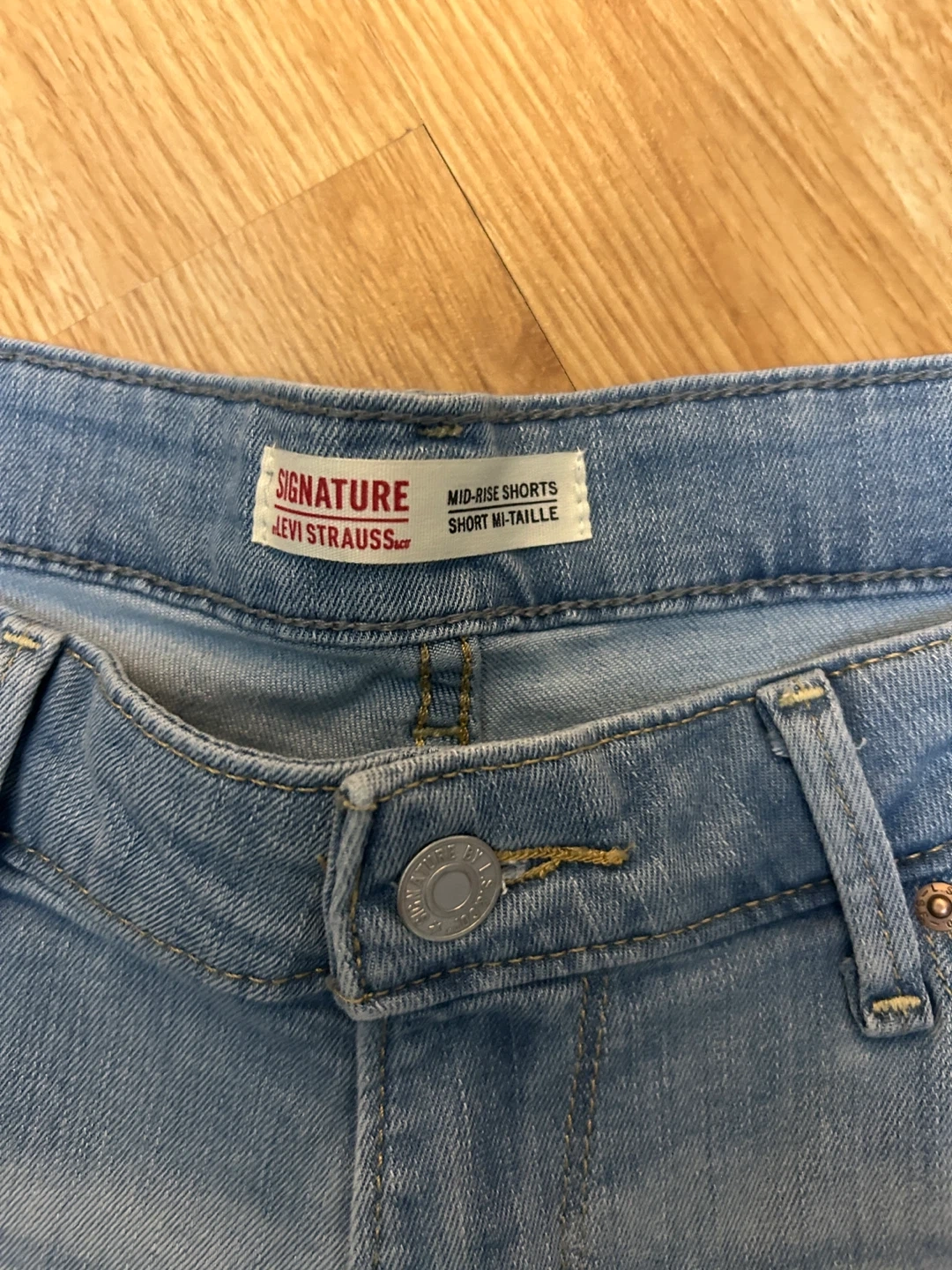 Light wash denim shorts from Levi Strauss Signature. Mid-rise style with a cuffed hem. Classic five-pocket design.