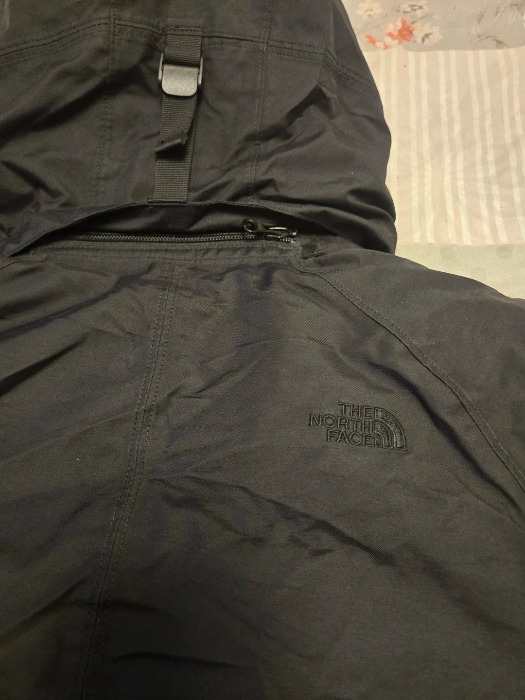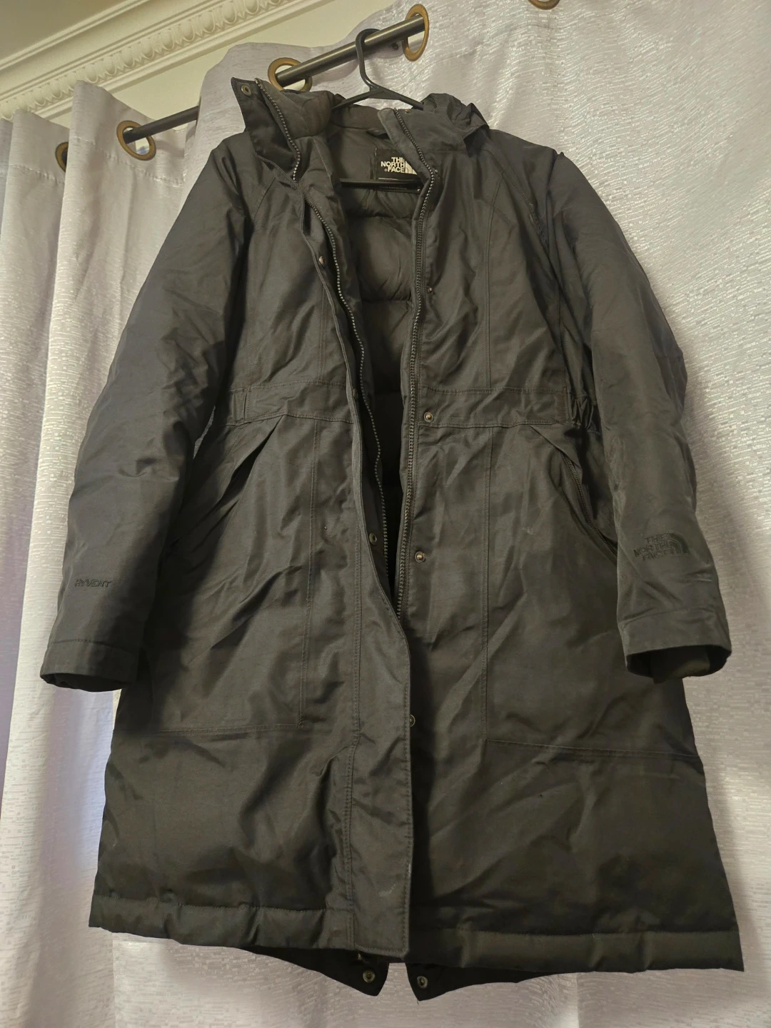 This is a black, hooded winter jacket from The North Face. It's a women's size small with a full zip closure. The jacket contains down fill for warmth. It's made with DryVent material.