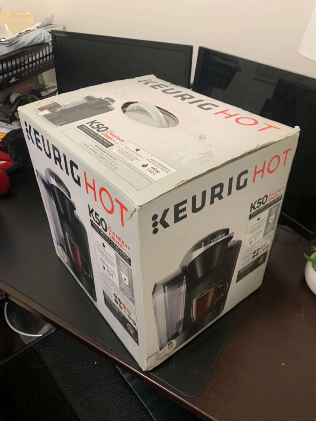 Never used before. This Keurig K50 Classic Series coffee maker brews K-Cup pods or ground coffee. It features a 48oz water reservoir and brews multiple cup sizes. The box includes the K50 brewer.