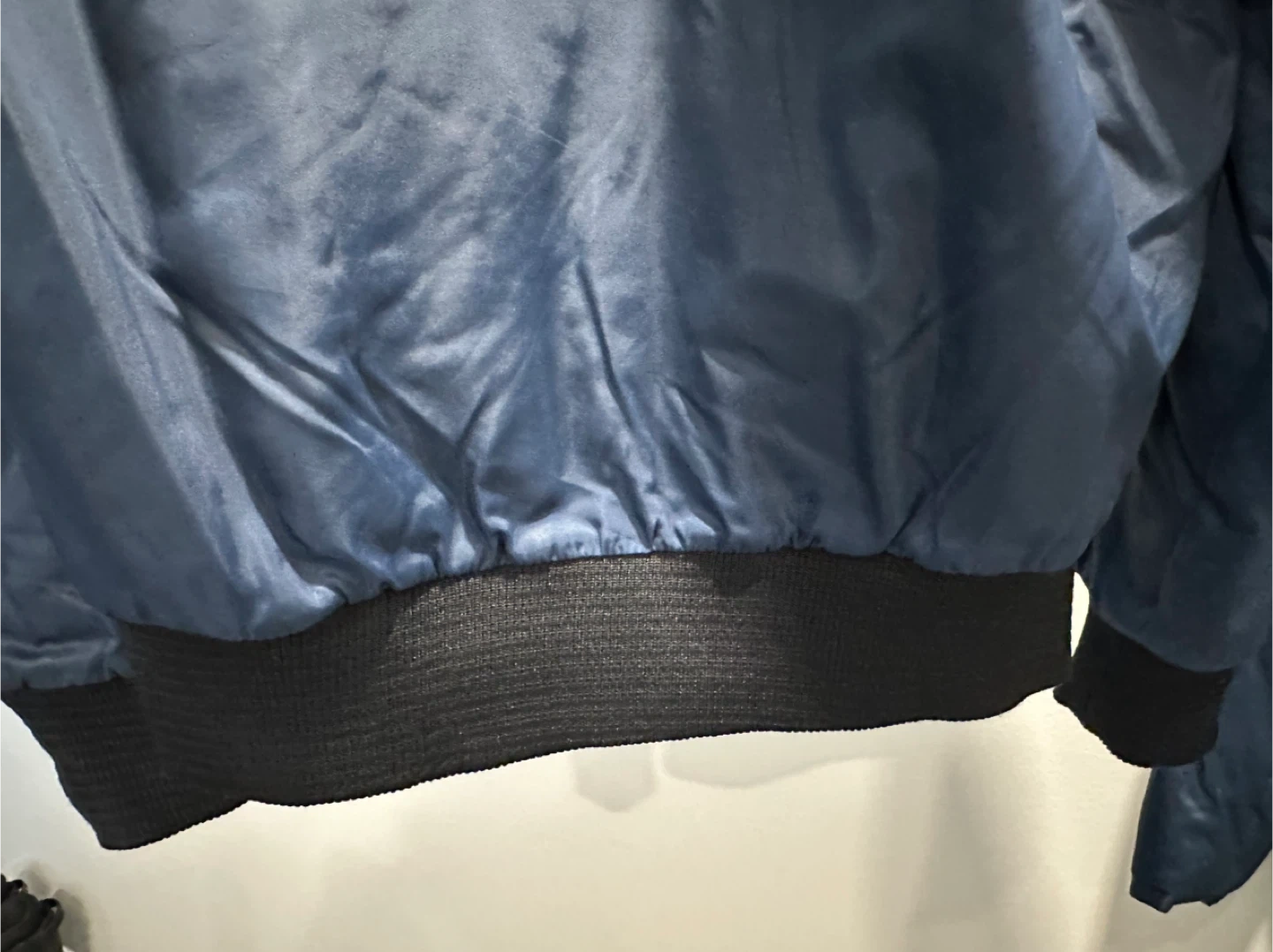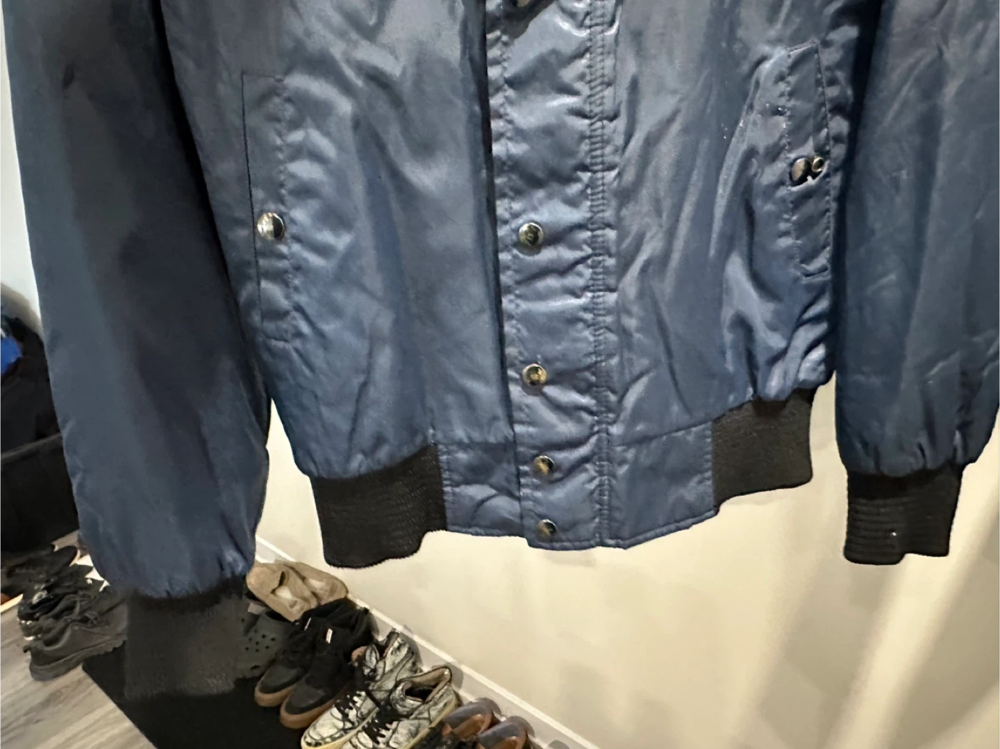 This is a blue bomber jacket featuring a removable faux fur collar. It has ribbed cuffs and hem for a snug fit. It's great for staying warm during cooler weather!