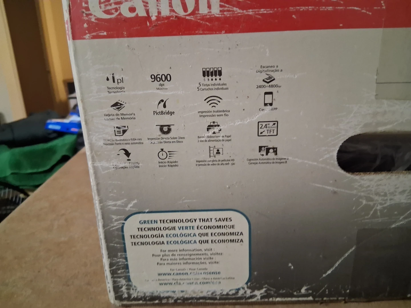 This is a Canon PIXMA MG5220 advanced wireless photo all-in-one printer with a 2.4" (6.0 cm) LCD screen. It's capable of print, copy, and scan functions. The printer includes the original box and packaging.