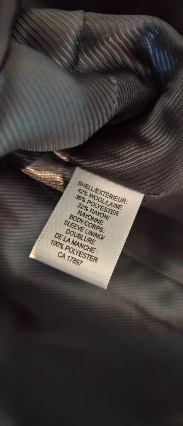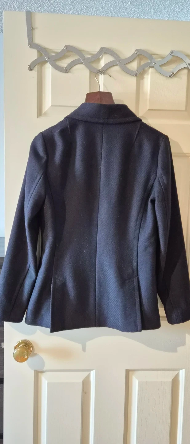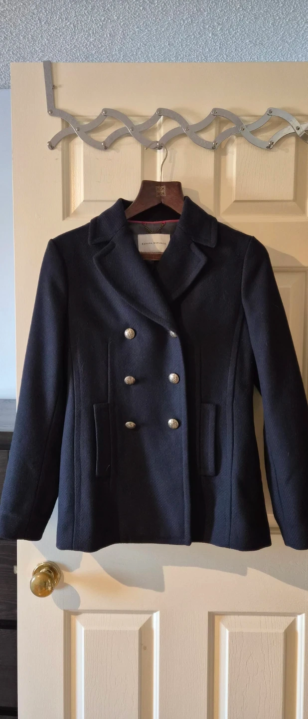 Navy double-breasted peacoat from Banana Republic. Size Medium. Shell is 42% wool, 36% rayon, 22% polyester. Sleeve lining is 100% polyester. Made in Philippines.