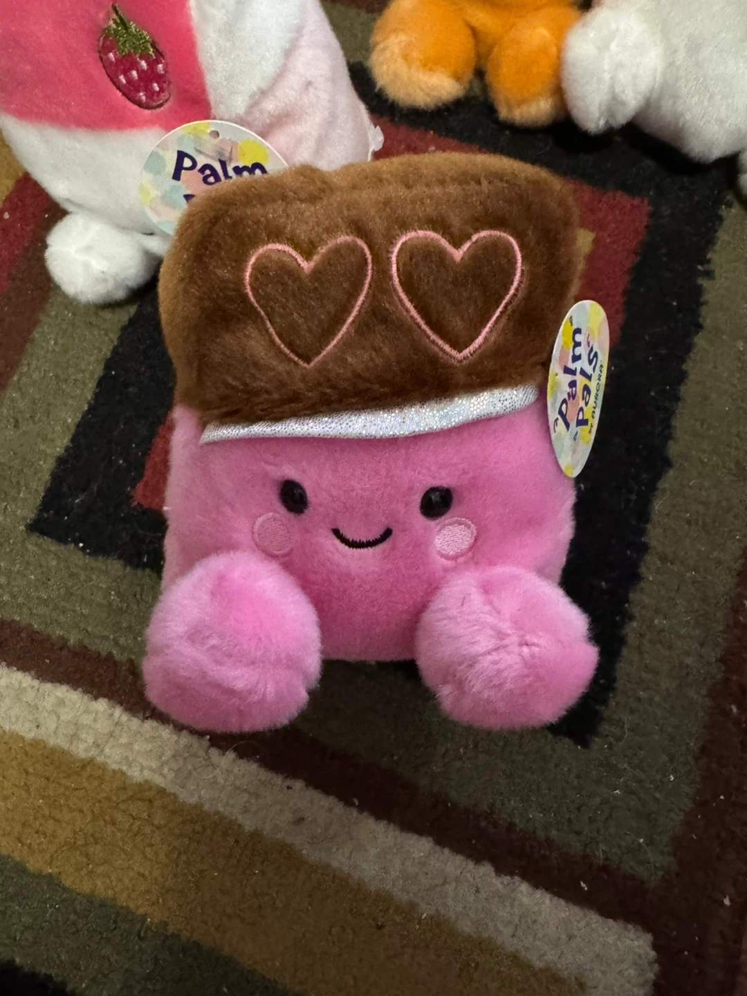 Collect these adorable Palm Pals plushies. This set includes a strawberry, a slice of cake, a chocolate bar, a cow, a carrot, and a Yeti. They're super soft and huggable!