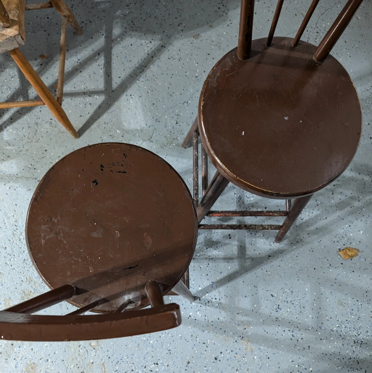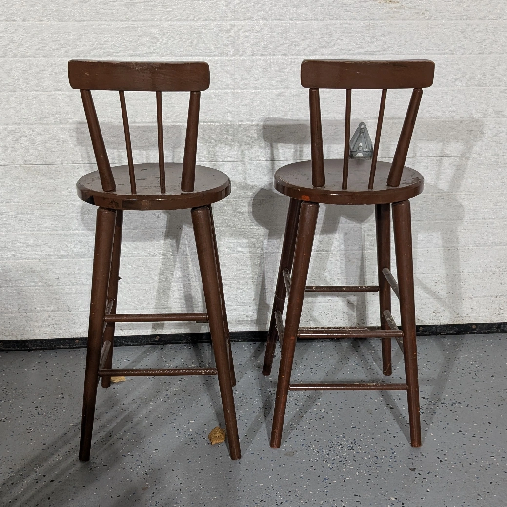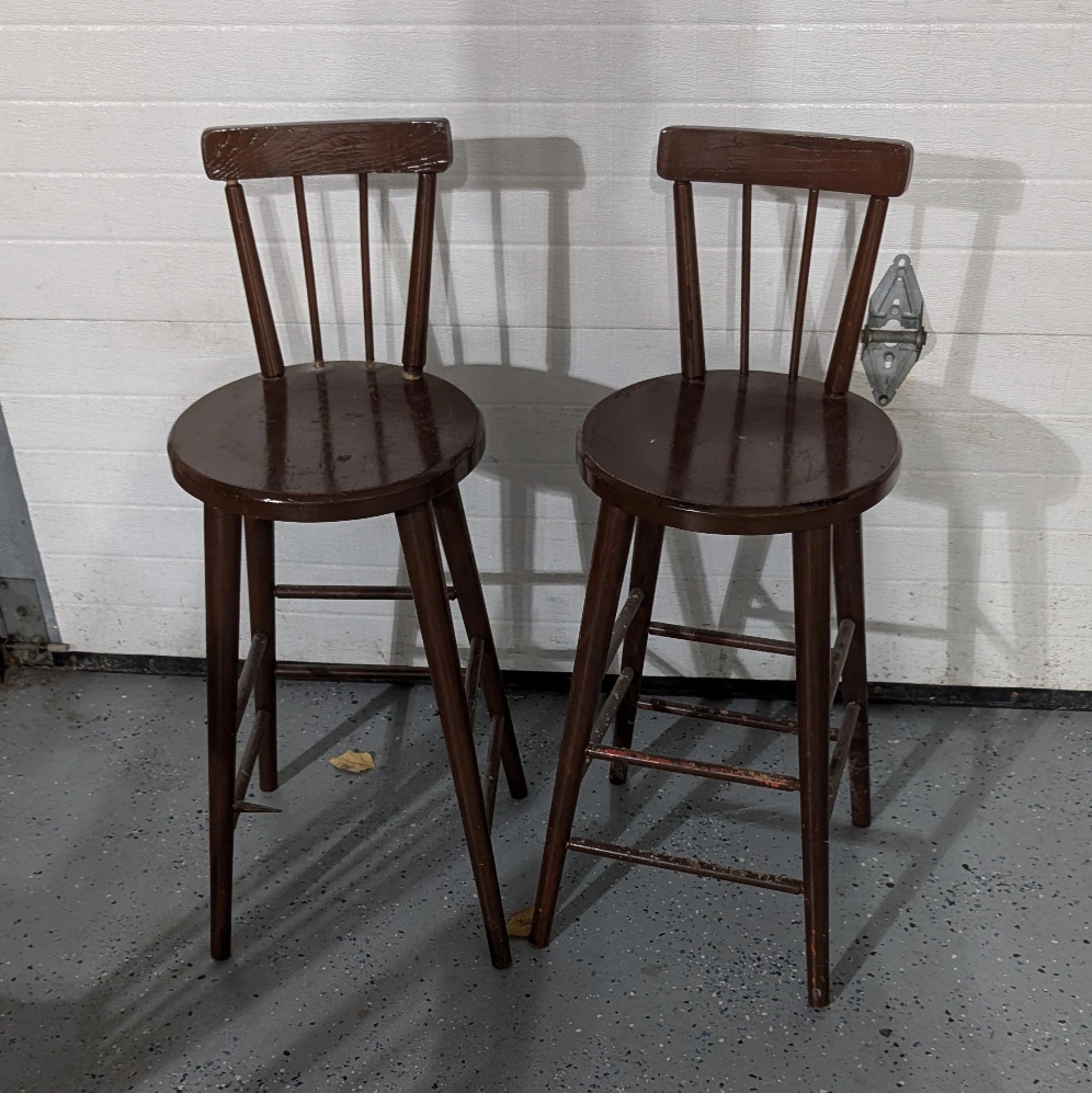 Seem to be made of solid wood so would be good for someone who may want to work on them. One chair is in pretty good shape, but the second one is missing some spindles. a couple of dowels should be able to fix that though.