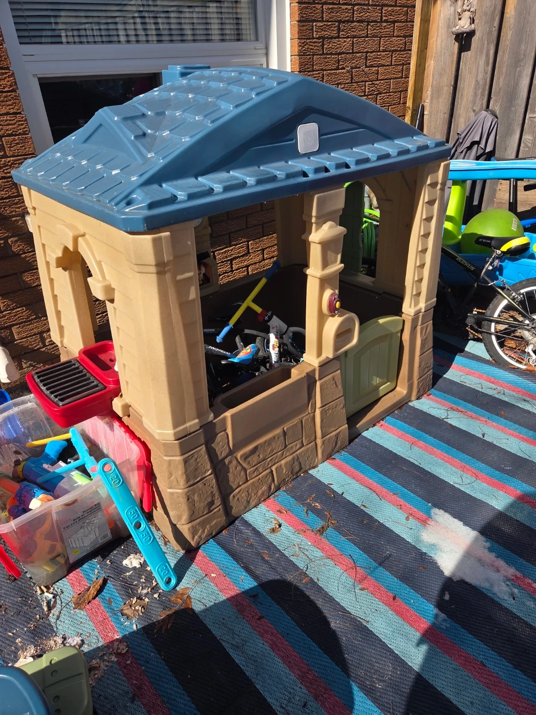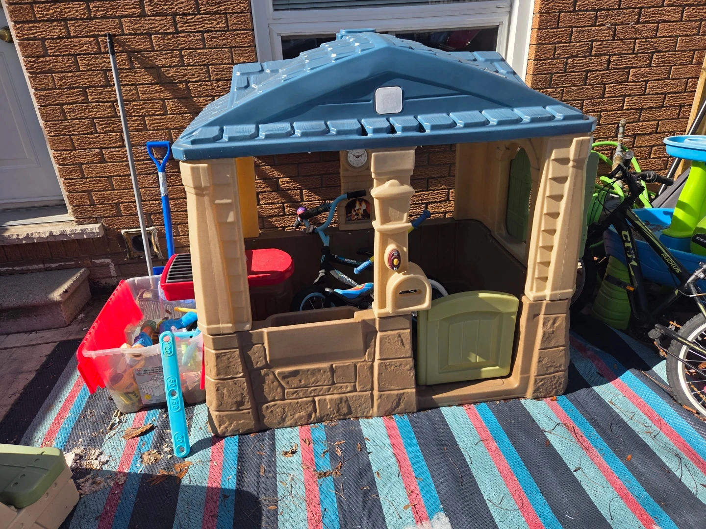 This is a used Little Tikes play house. It features a clock, fireplace and a sink with a grill. Great for outdoor play!