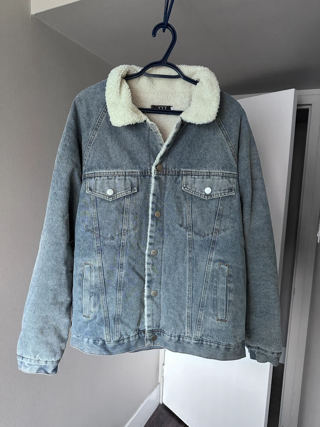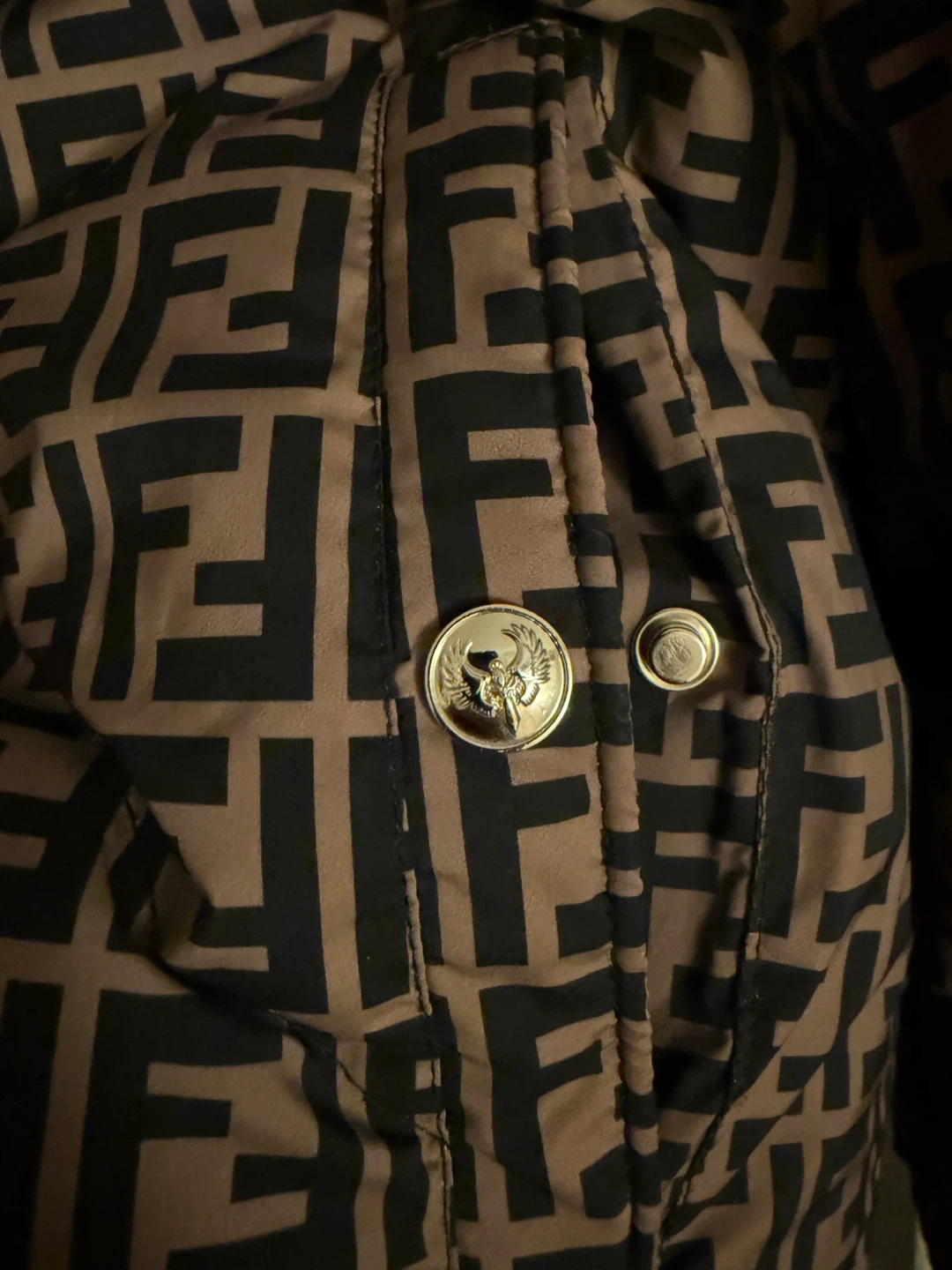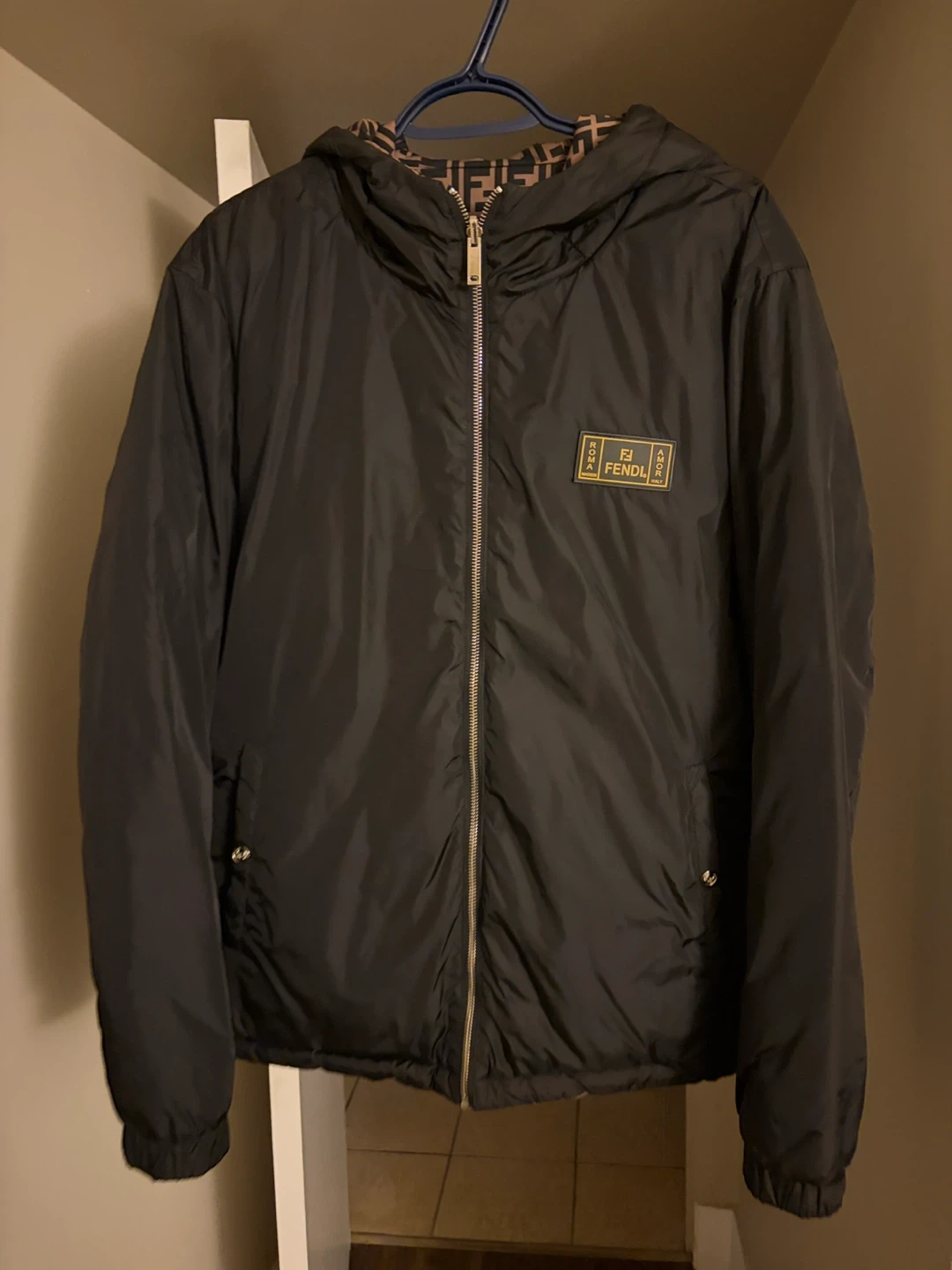 Selling a stylish Fendi jacket that's reversible! One side is black, and the other features the classic Fendi brown logo pattern. It's in great condition and ready for a new home. Will fit M- Xl sizes . Denim jacket comes as a gift.