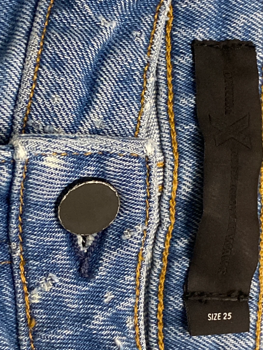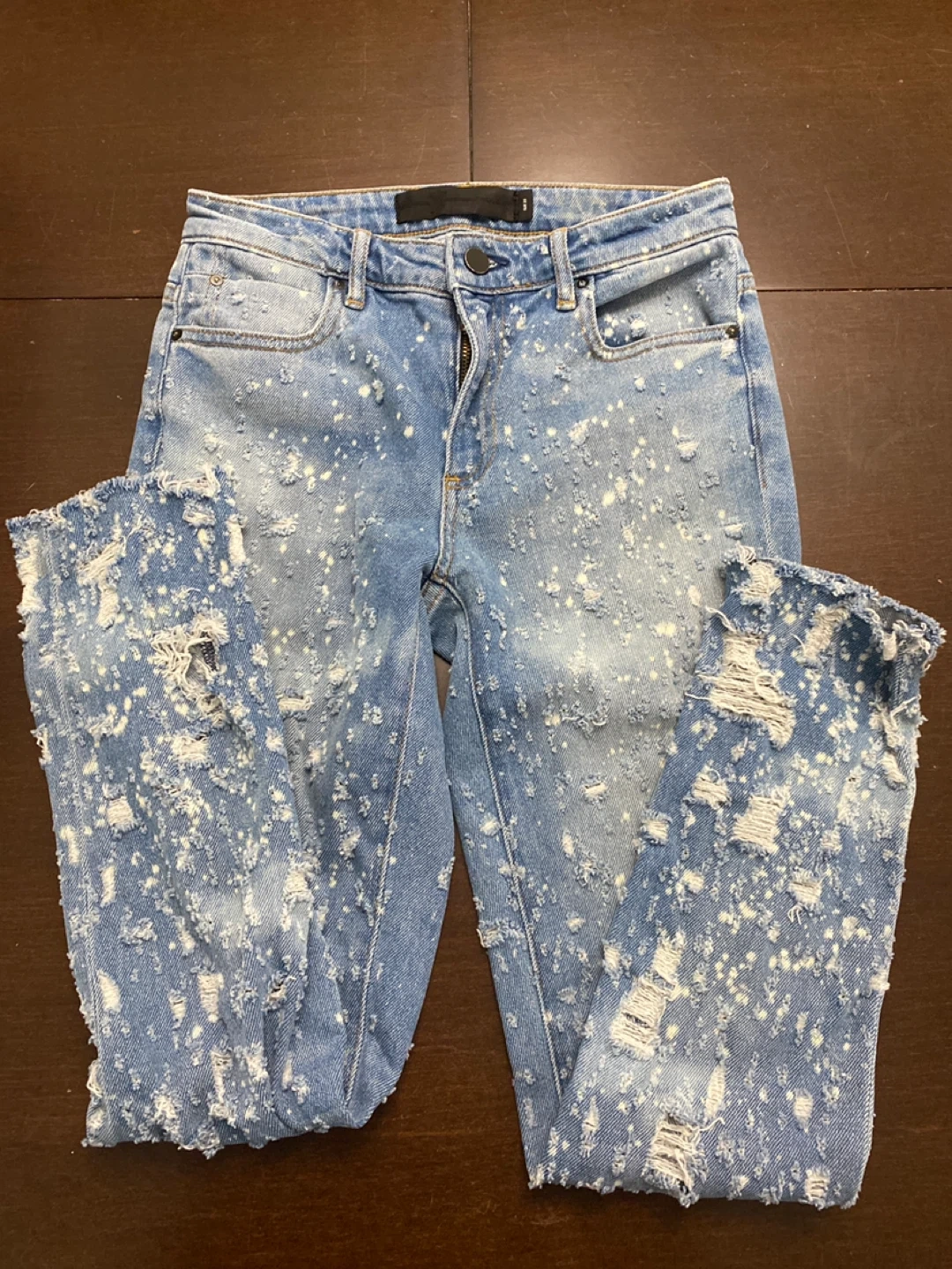 Alexander Wang denim jeans with a distressed, bleach-splatter design. Size 25. These jeans have a unique, edgy look with ripped details throughout.