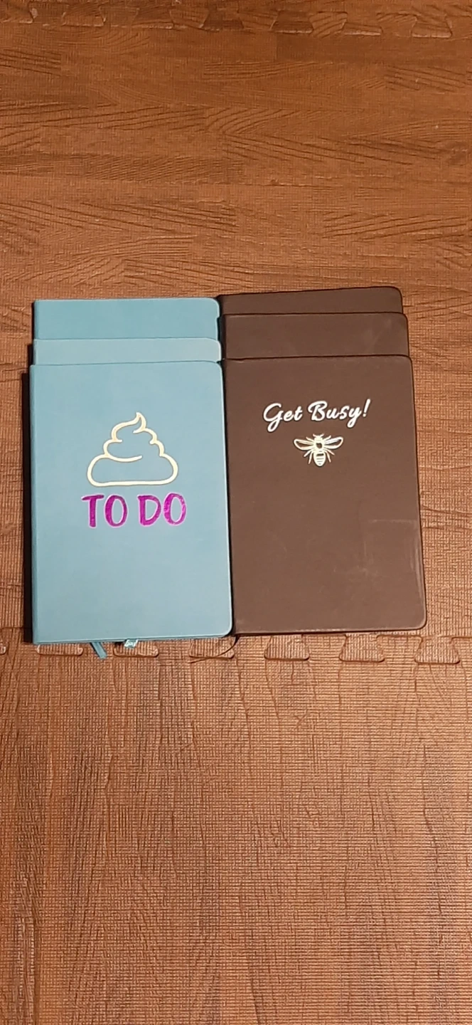 Set of two pocket notebooks. One is light blue with "TO DO" printed on it, featuring a stylized poop emoji graphic. The other is brown with "Get Busy!" and a bee graphic. Both have simple, durable covers.,,