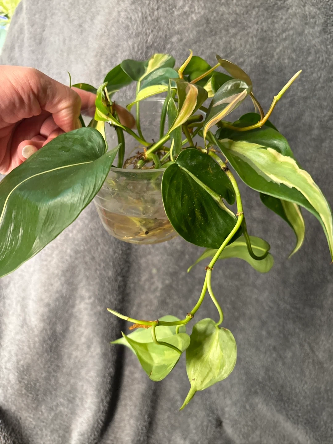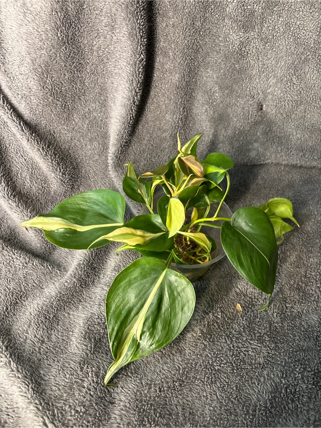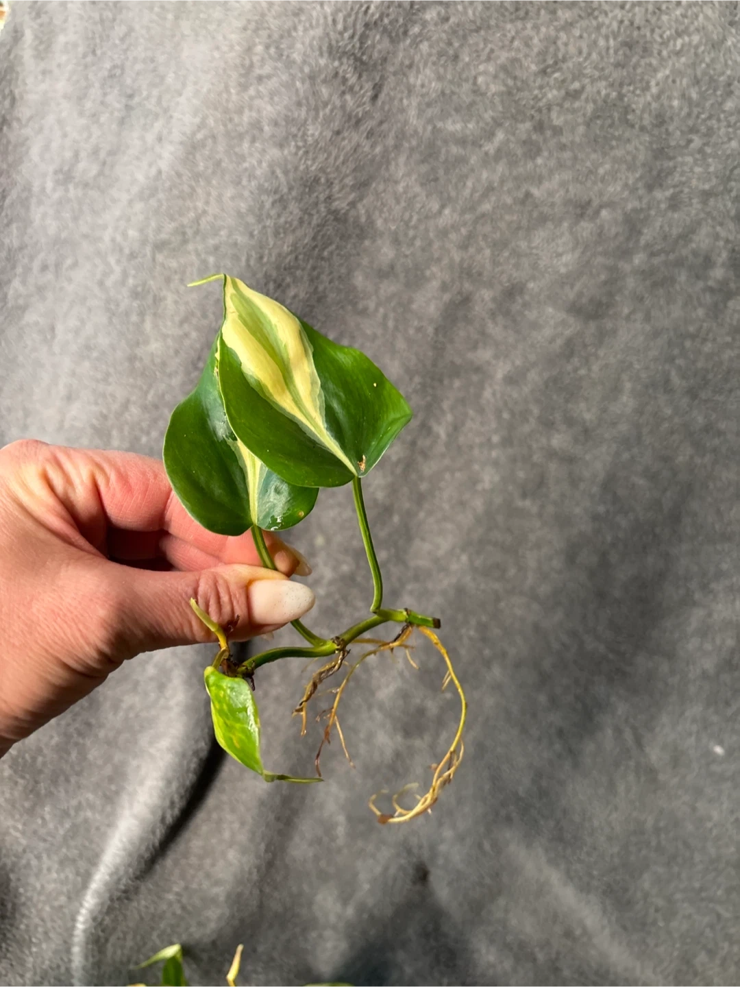 This is a healthy Philodendron silver stripe plant cutting with variegated leaves. It's currently rooted in water. This plant is known for its heart-shaped leaves with streaks of yellow and green. Perfect for starting a new plant or adding to an existing collection!
