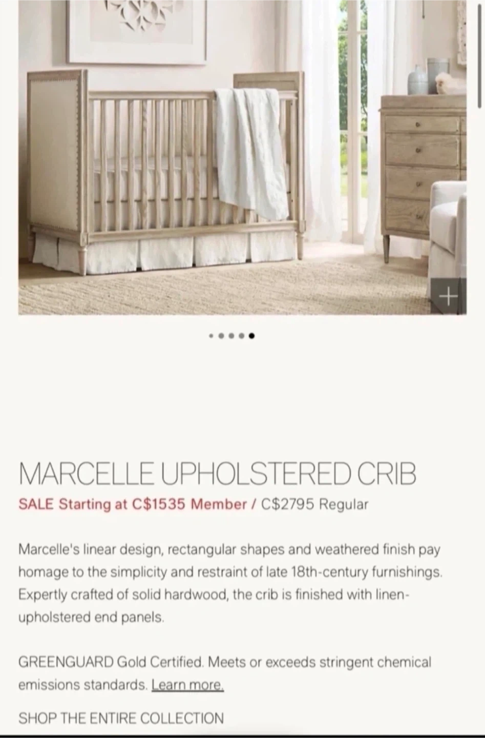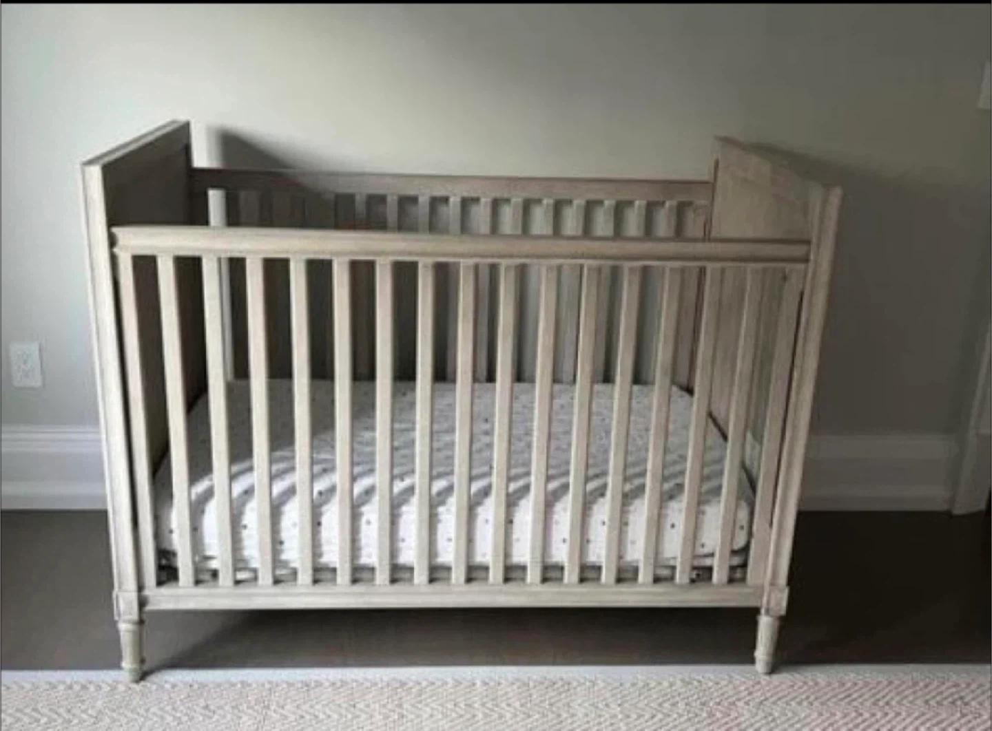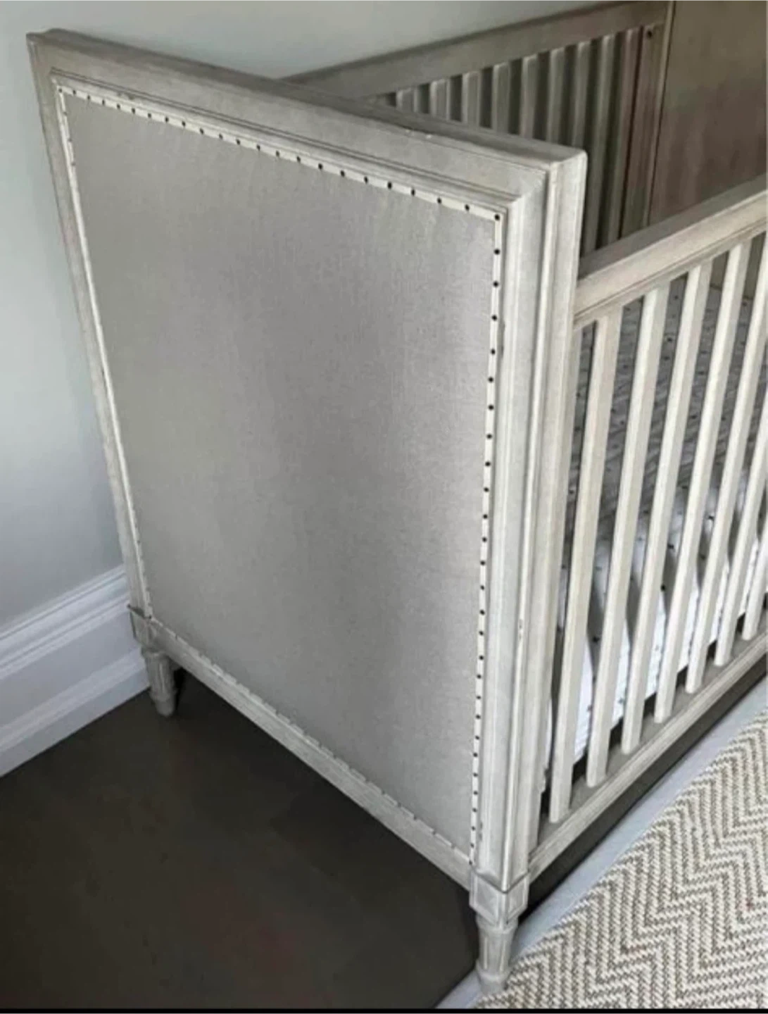 Selling a Marcelle upholstered crib. It features a linear design, rectangular shapes, and a weathered finish, paying homage to the simplicity and restraint of late 18th-century furnishings. Expertly crafted with solid hardwood, the crib includes linen-upholstered end panels. It's also GREENGUARD Gold Certified, meeting or exceeding stringent chemical emissions standards