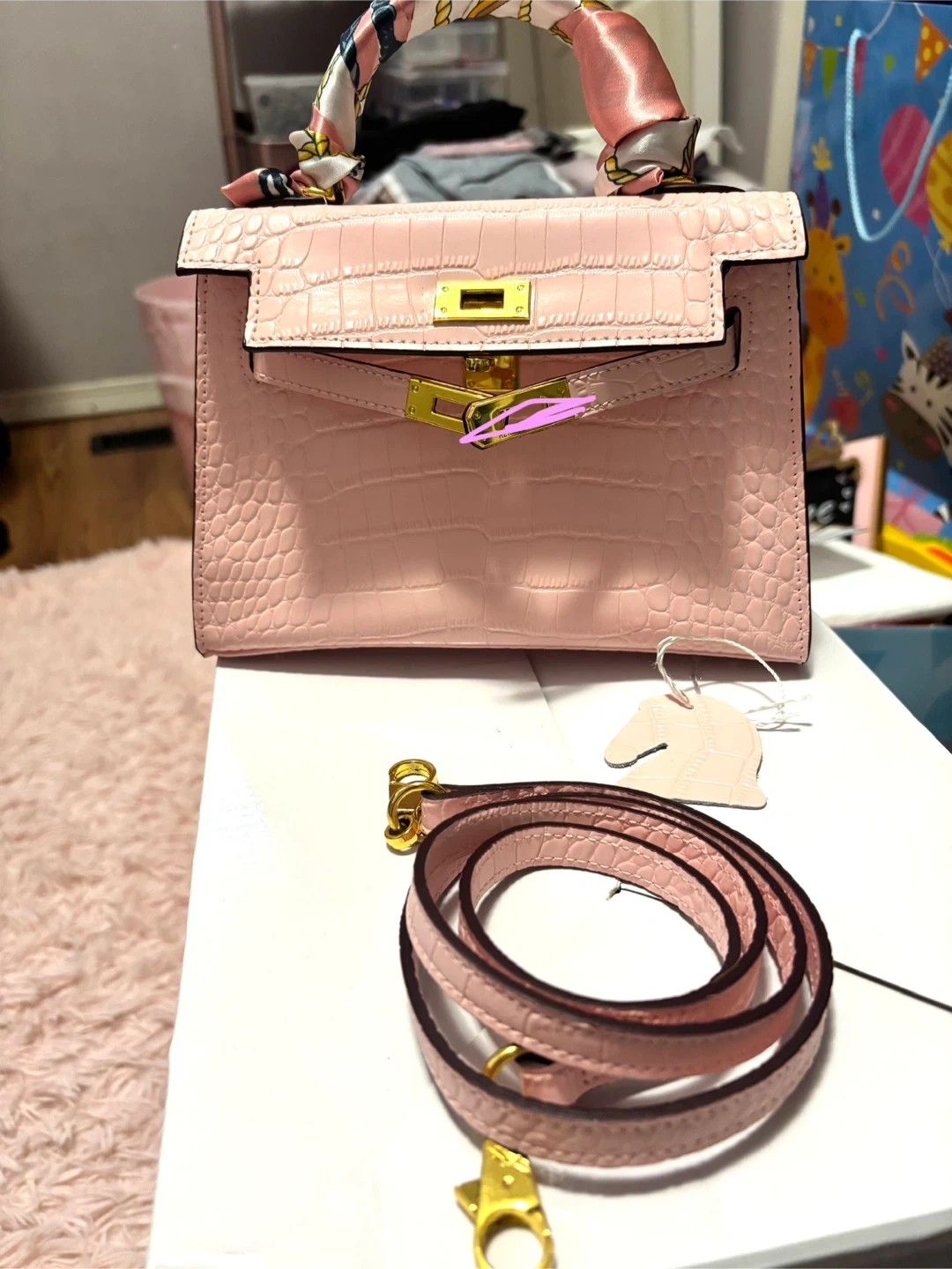 This stylish pink top handle bag features a croc-embossed finish. It comes with a matching strap and a decorative scarf tied to the handle. Gold-toned hardware adds a touch of elegance. Perfect for adding a pop of colour to any outfit!