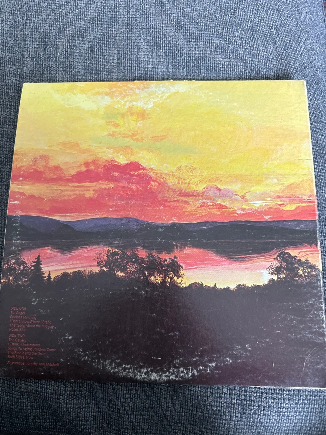This is Joni Mitchell's 1969 album "Clouds" on vinyl. It's the original pressing, featuring songs like "Both Sides, Now" and "Tin Angel". This record is a classic for any music lover's collection!
