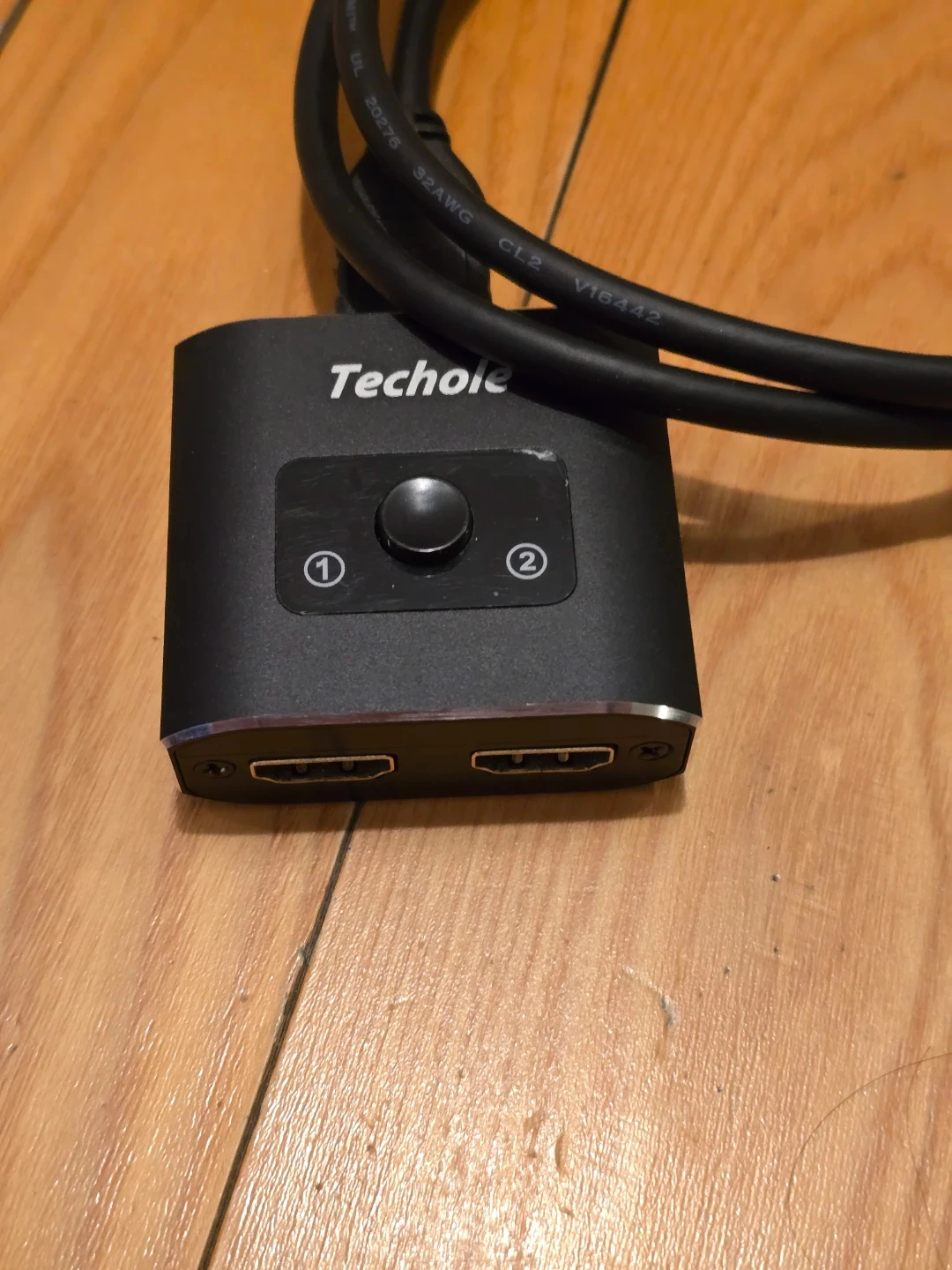 Great working condition- good to connect two devices to a monitor. This is a Techole 2-port HDMI switch. It allows you to connect two HDMI sources to one display. Switching between inputs is done with the button on top.