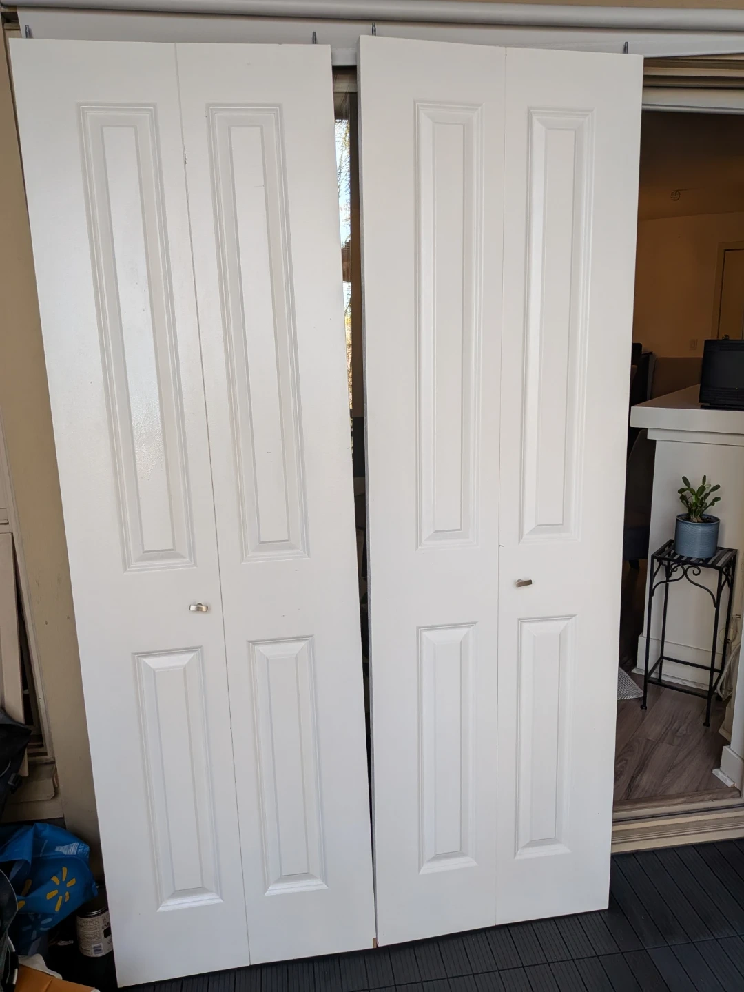 Four white bi-fold doors, each with a modern brushed nickel pull. Some minor wear and tear, including a small chip on the bottom edge of one door. They're perfect for closets or small spaces! Great condition overall.