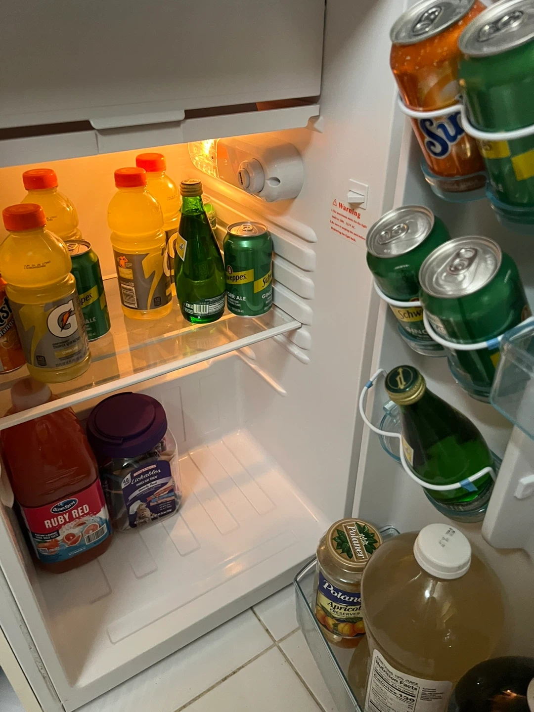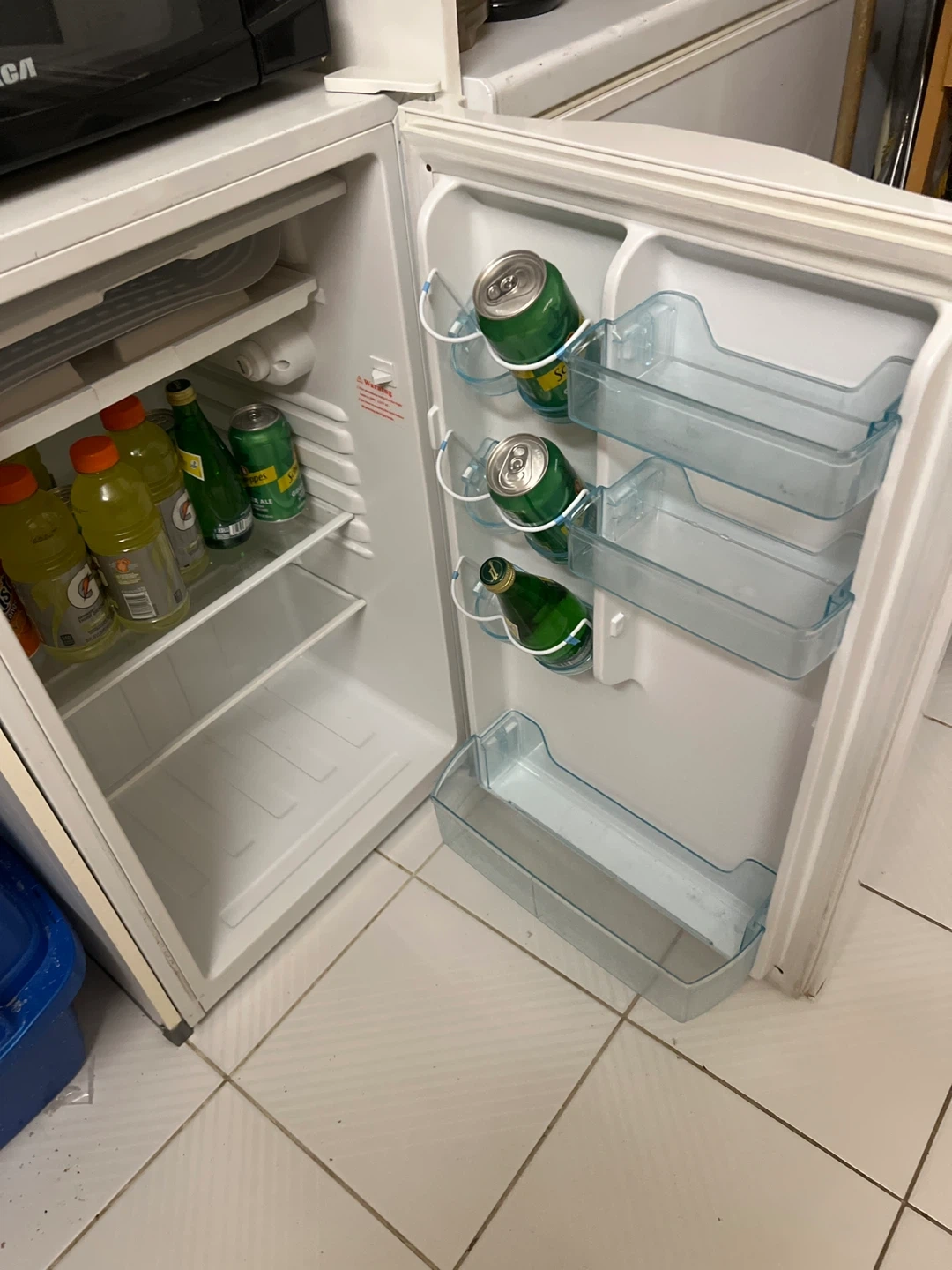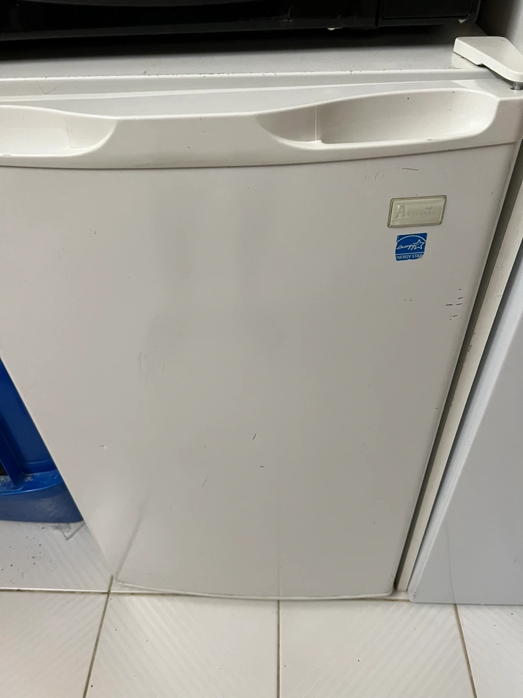 This is a white Avanti compact refrigerator. It's Energy Star certified. It includes door shelves and interior shelving. The top includes a freezer that works perfectly.
