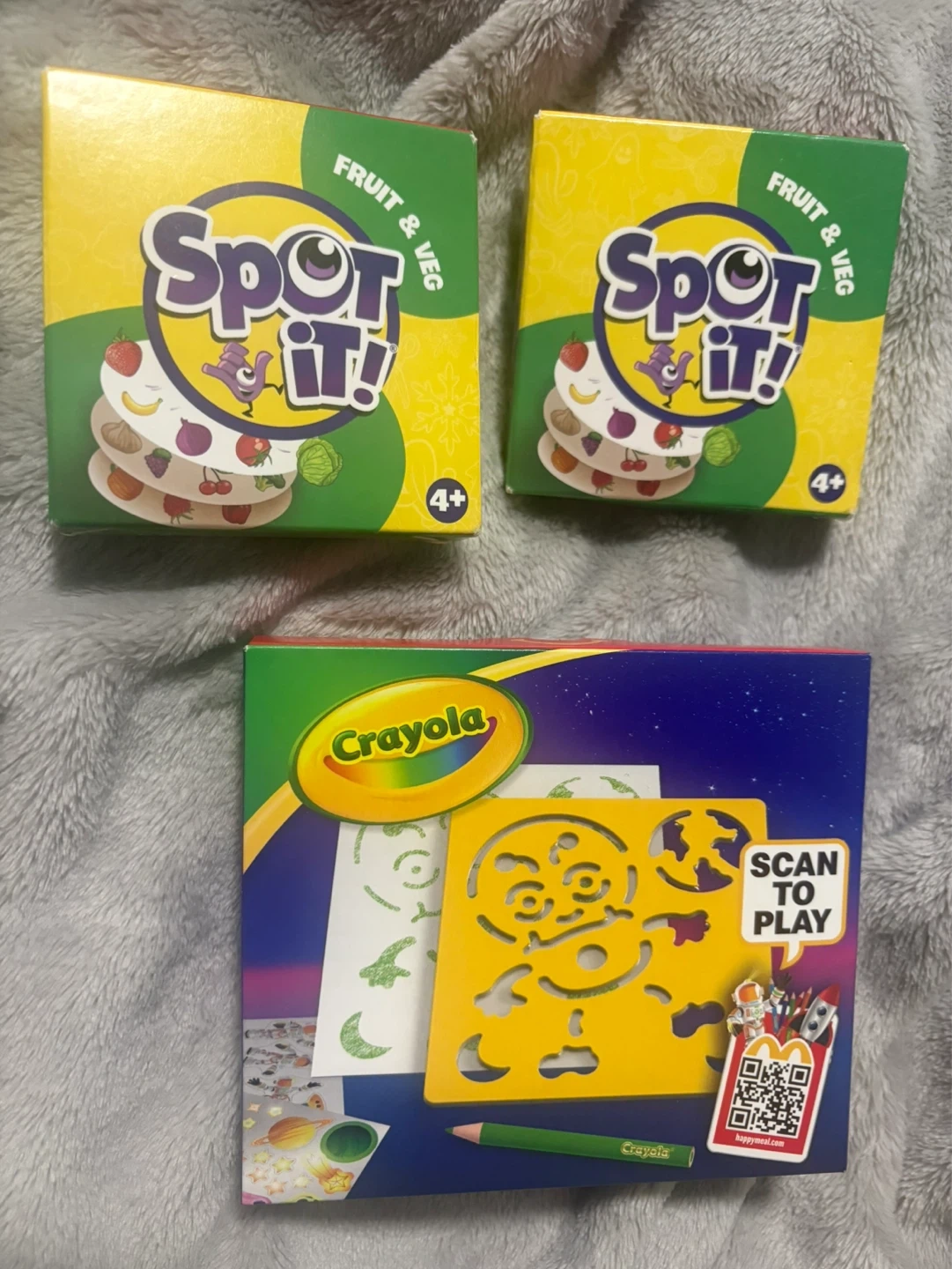 Two Spot It! Fruit & Veg games, perfect for ages 4 and up! Also includes a Crayola activity kit with stencils and stickers. Fun for the whole family!
