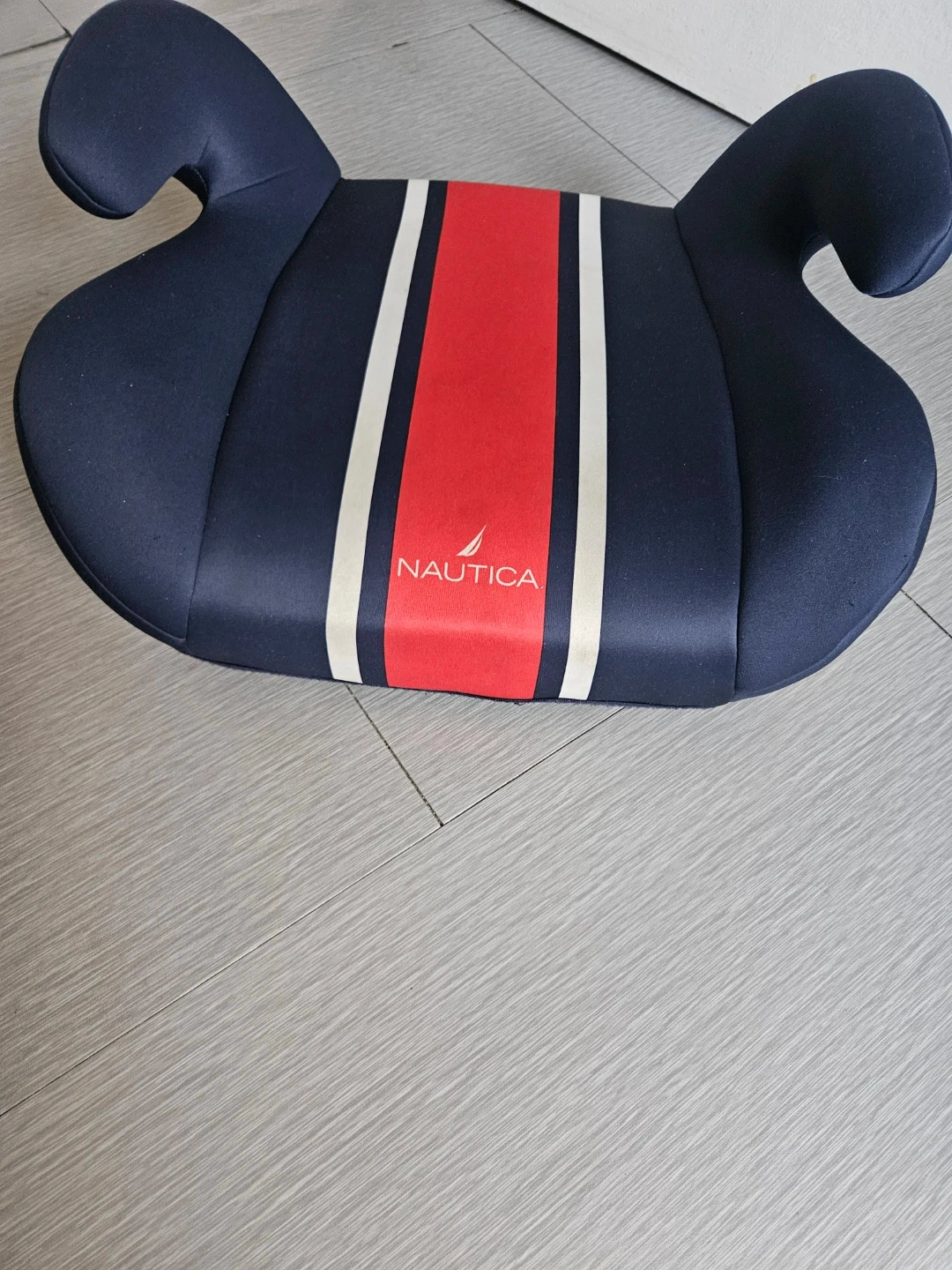 This is a Nautica booster car seat. It's a comfortable and safe option for your child's travel. The seat is made of durable fabric.