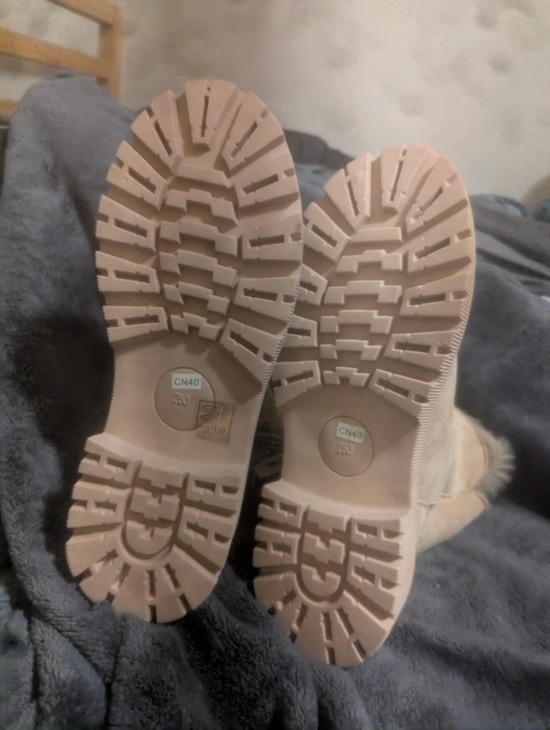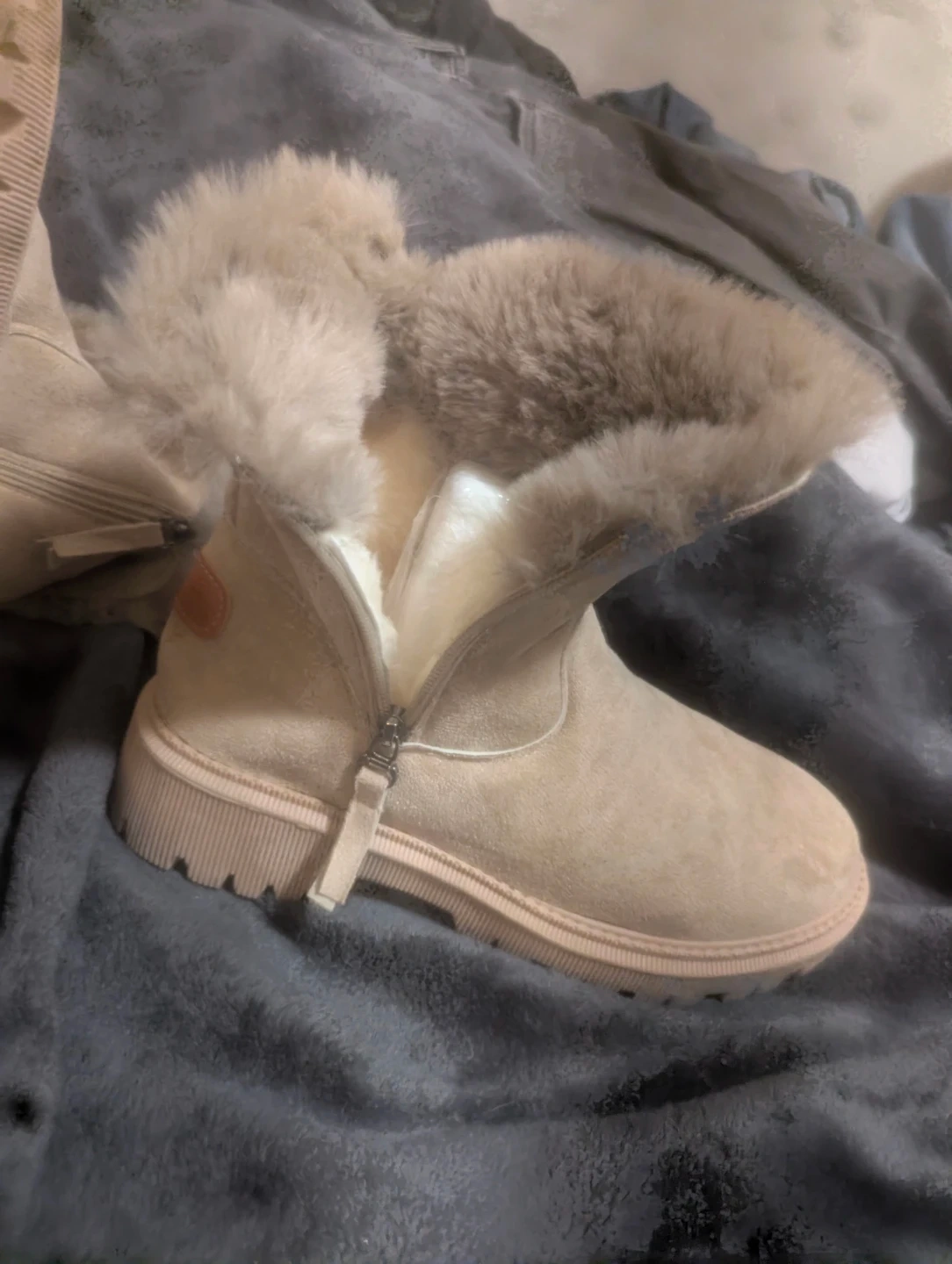 Cozy up your feet in these tan winter boots! They feature a faux suede exterior with a super soft faux fur lining and trim for extra warmth. The side zipper makes them easy to get on and off. They have a durable lug sole for good traction. Size 250 (approx. women's 8.5 Canadian).