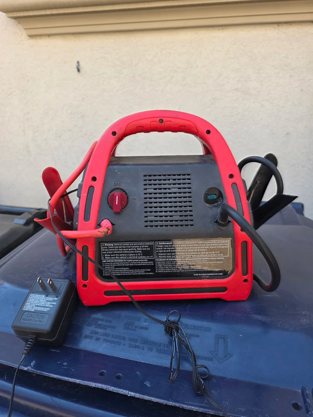 This MotoMaster battery booster pack is red and black. It has a 1200 peak amp rating and includes a charging adapter. Useful for jump-starting a dead car battery when you're on the go!