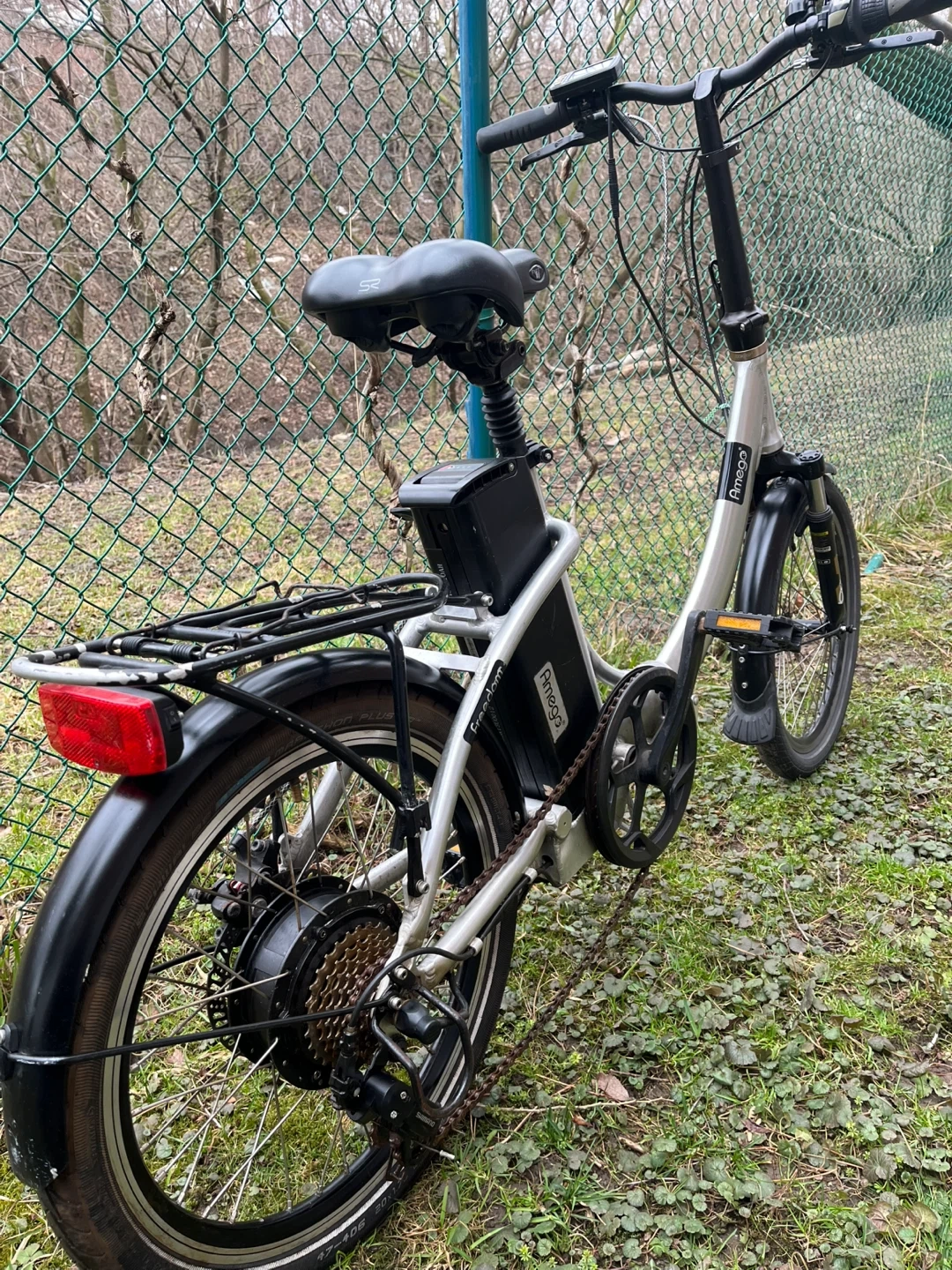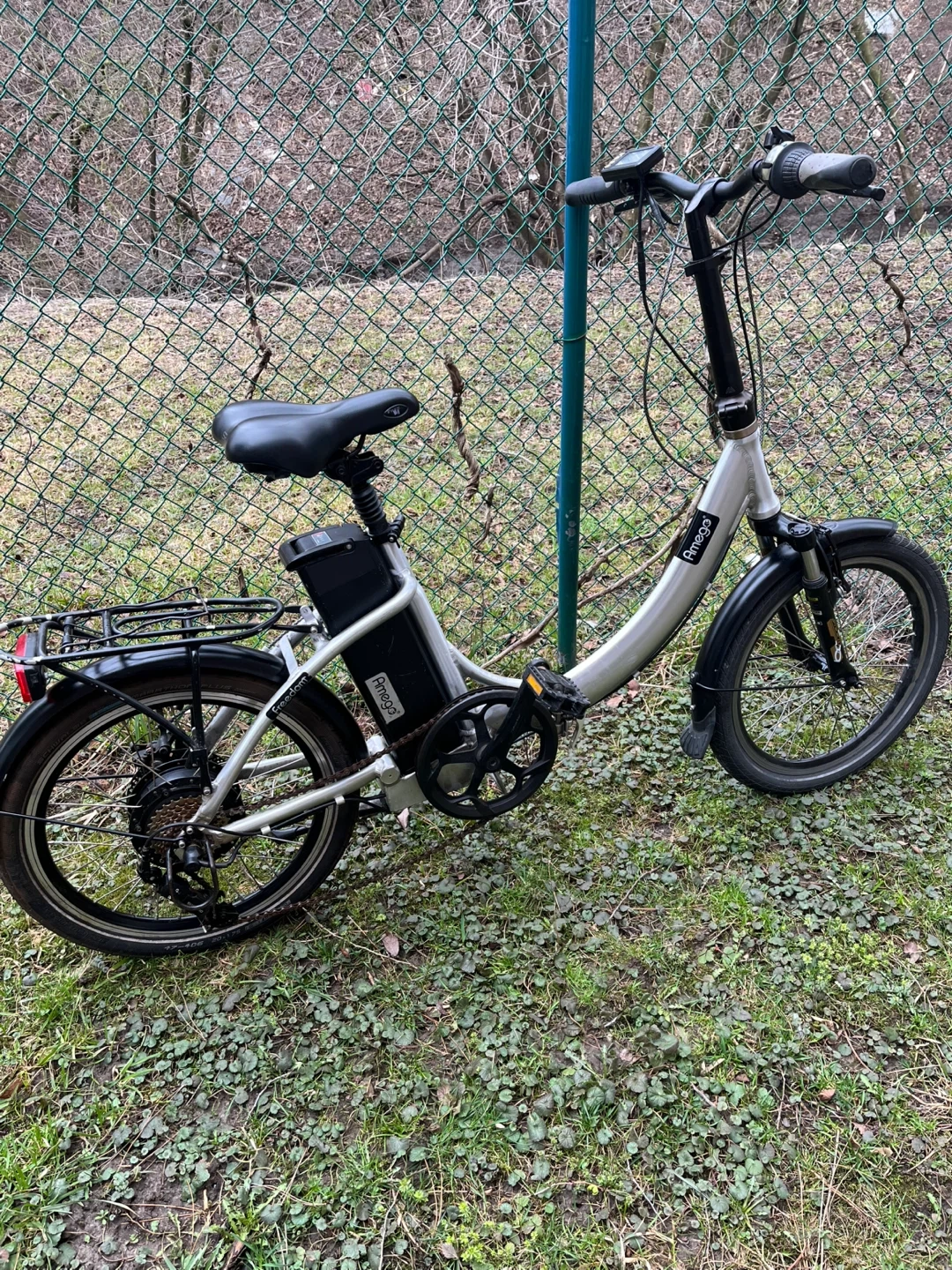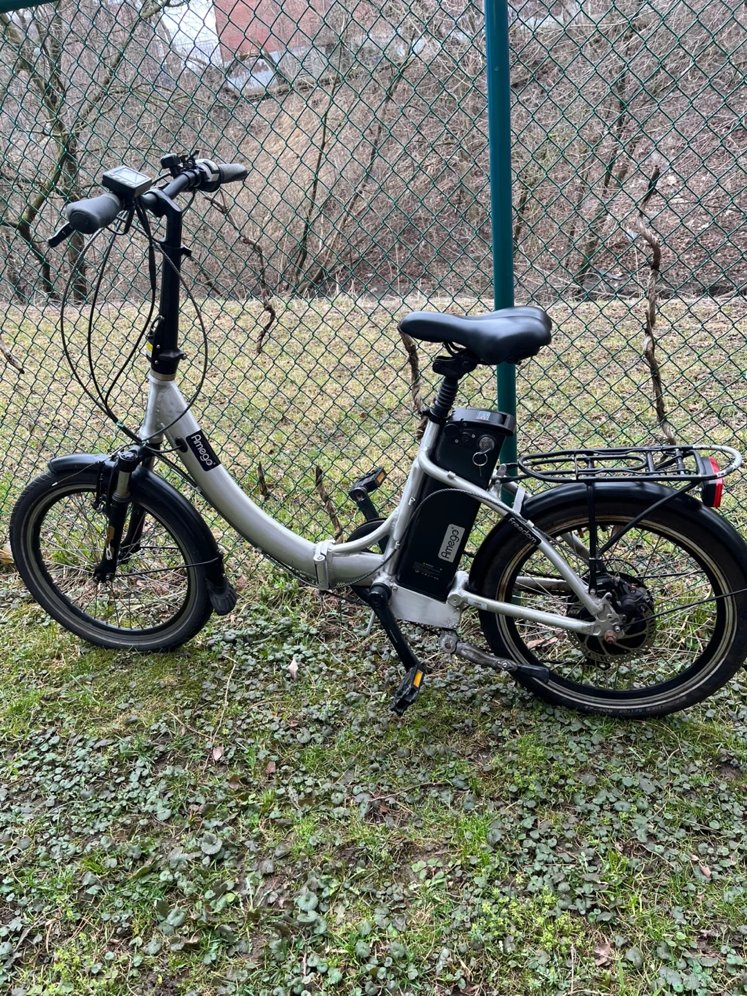 This is an Amego folding electric bike. It's a silver color with 20-inch wheels. The frame, stem, and pedals are all foldable. This bike's design makes it convenient for storage and transportation. It needs battery repairs and front brakes adjustment, otherwise everything in good shape, it comes with a charger, selling as is.