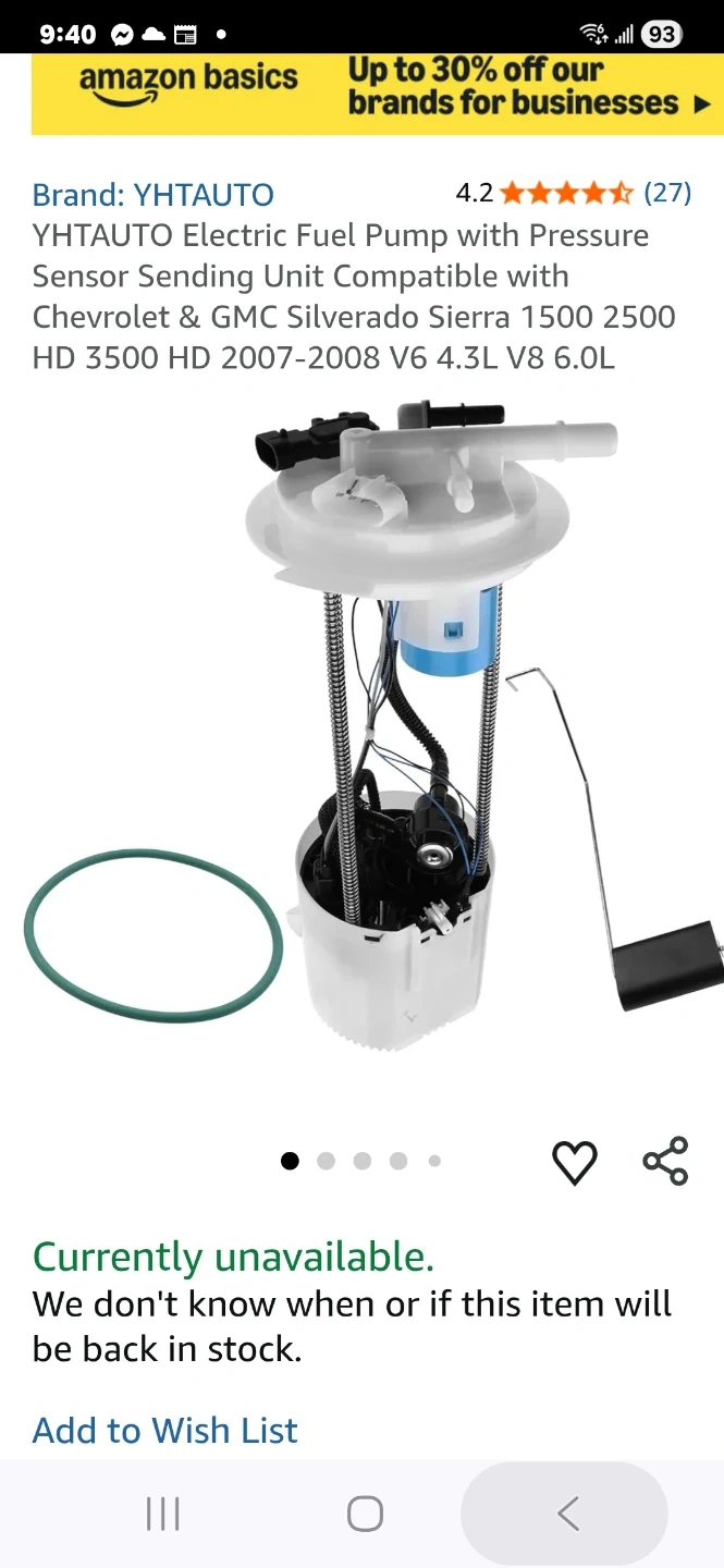 This YHTAUTO electric fuel pump assembly includes a pressure sensor and sending unit. It's compatible with Chevrolet & GMC Silverado Sierra 1500, 2500 HD, and 3500 HD models from 2007-2008, fitting V6 4.3L and V8 6.0L engines. Comes with a gasket ring.
