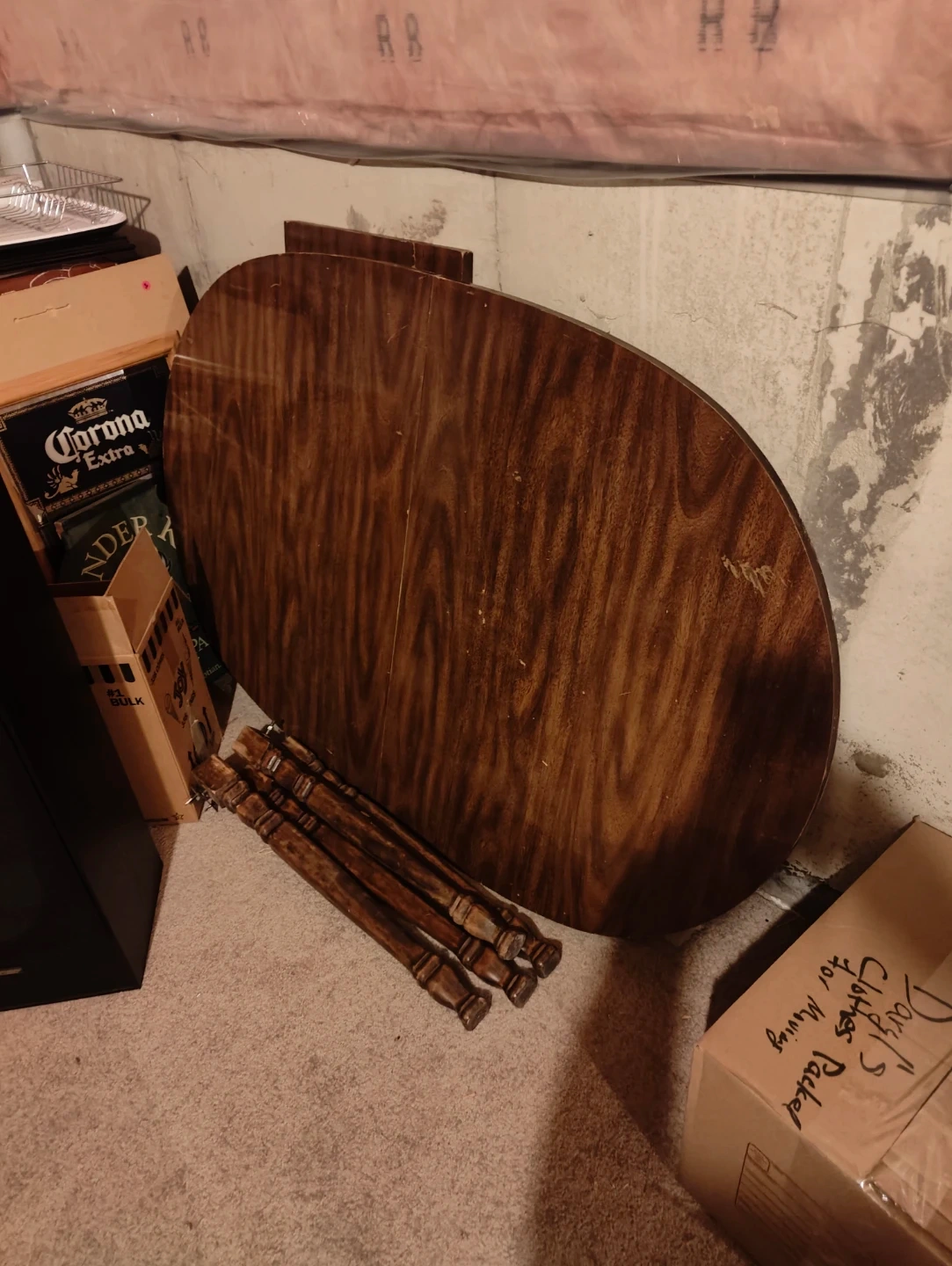 This is a wooden dining table with a rich wood grain finish. It comes with four detachable, carved wooden legs. The table top is oval-shaped and seems to be made of wood veneer.