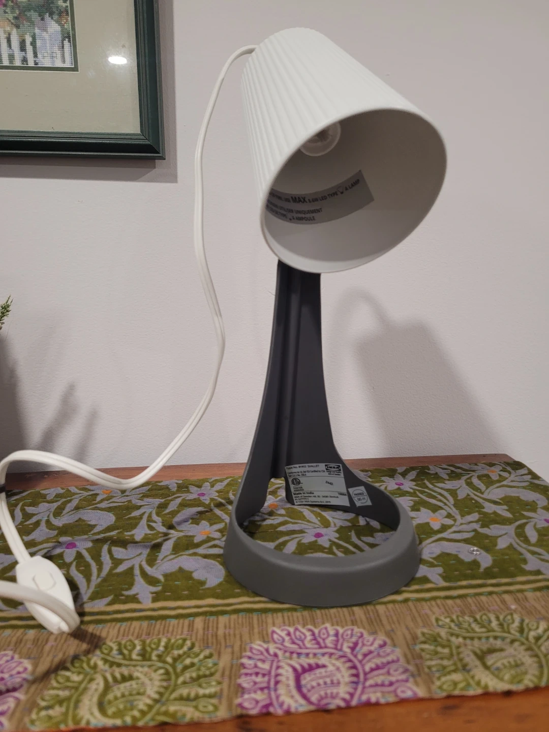 This is an IKEA SOLHETTA LED desk lamp with a white pleated shade and grey base. It's a simple and functional lamp, great for a desk or side table. It uses an E12 base bulb and is energy efficient.