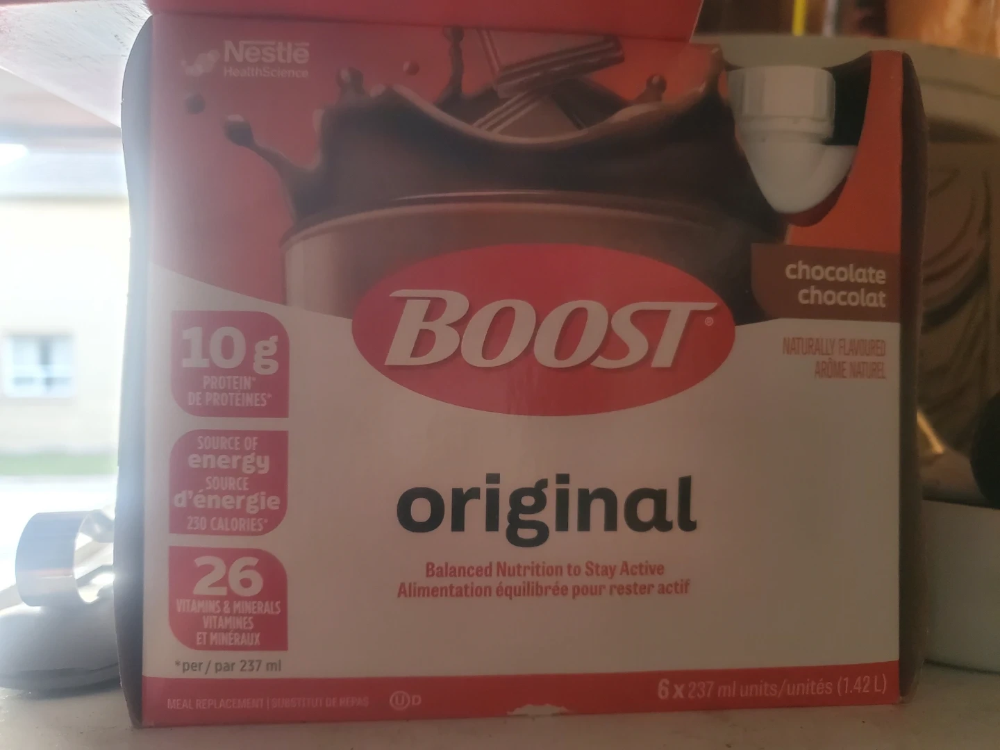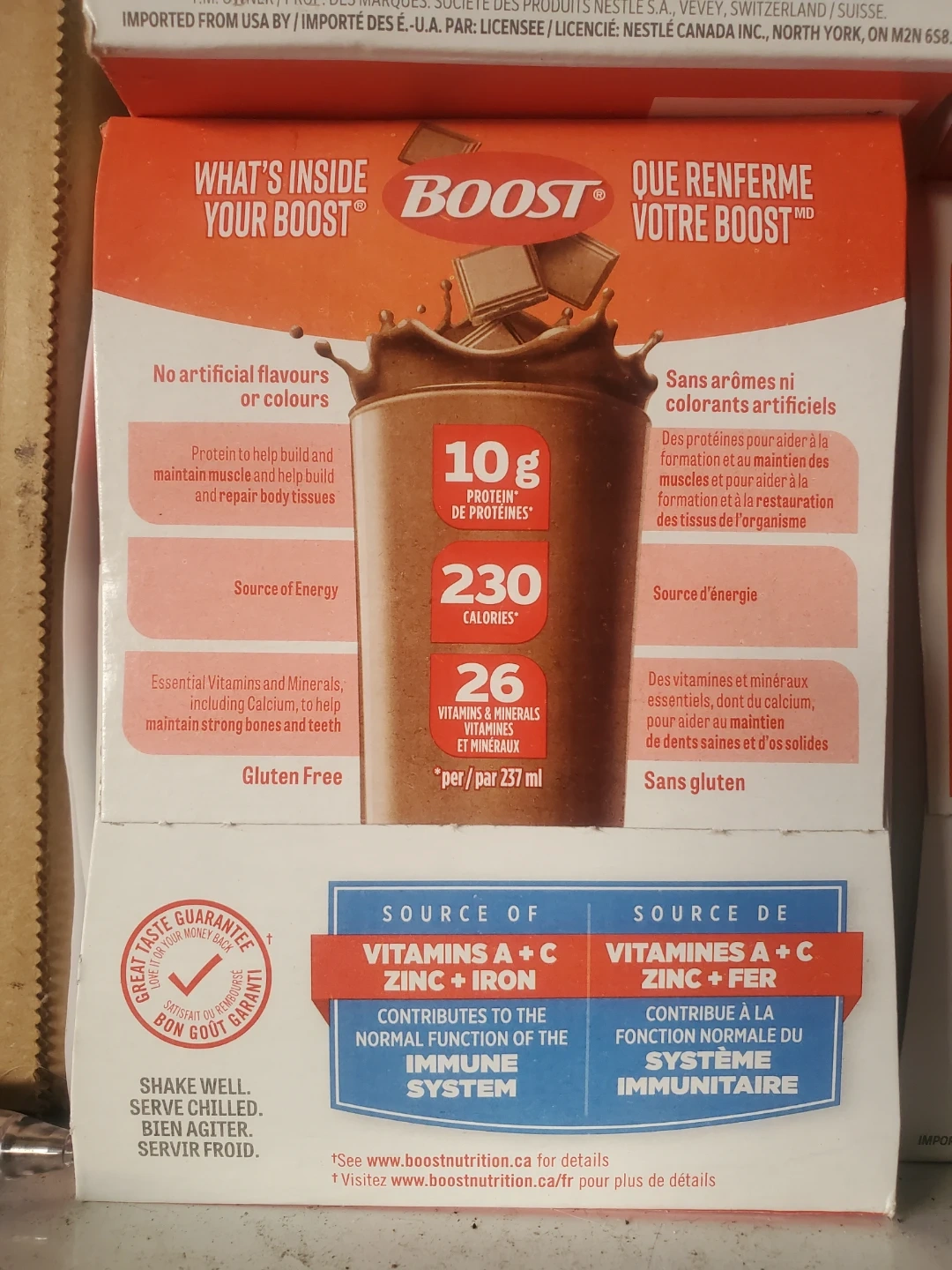 This Boost Original chocolate flavoured drink offers balanced nutrition. It contains 10g of protein per serving and 26 essential vitamins and minerals. Shake well, serve chilled, and stir before drinking.