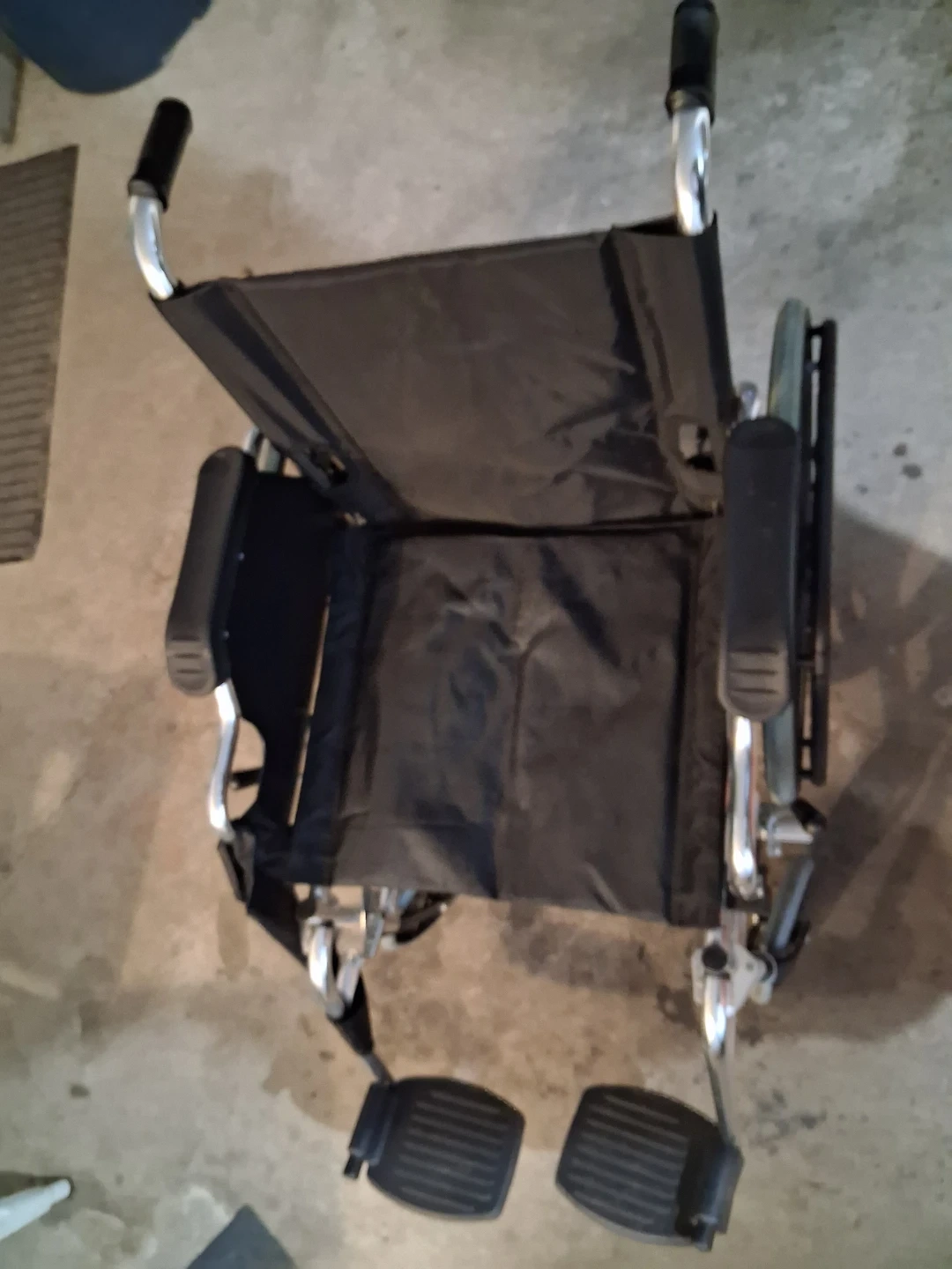 This is a standard manual wheelchair designed for mobility assistance. It's made with a durable black fabric seat and backrest, supported by a silver metal frame. Padded armrests and adjustable footrests are included for comfort. This wheelchair is easy to manoeuvre and folds for storage.