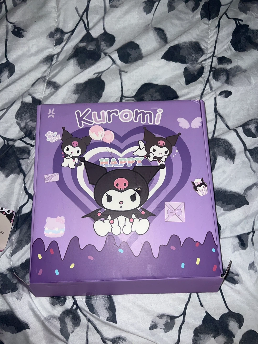 This is a cute Kuromi stationery set filled with pens, stickers, and other accessories. It includes several pens, decorative stickers, keychains, and bookmarks. Everything is in a lovely purple theme!