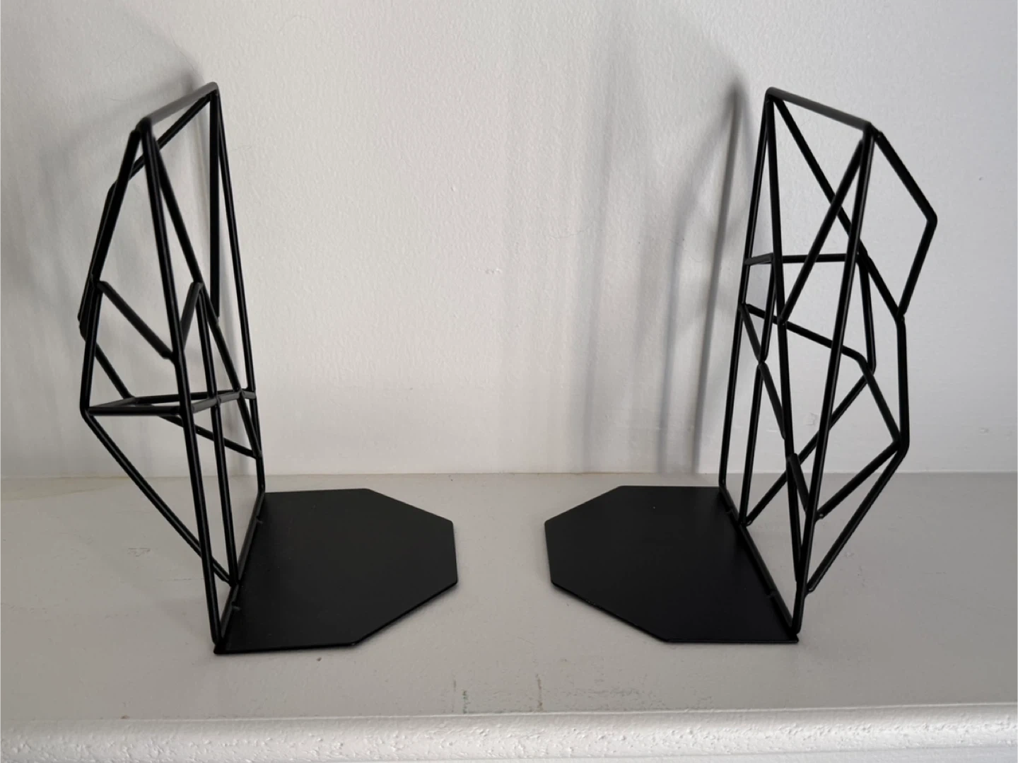 A pair of black metal bookends with a modern geometric design. They're made of sturdy metal to hold your books upright. These bookends are great for adding a stylish touch to any bookshelf.