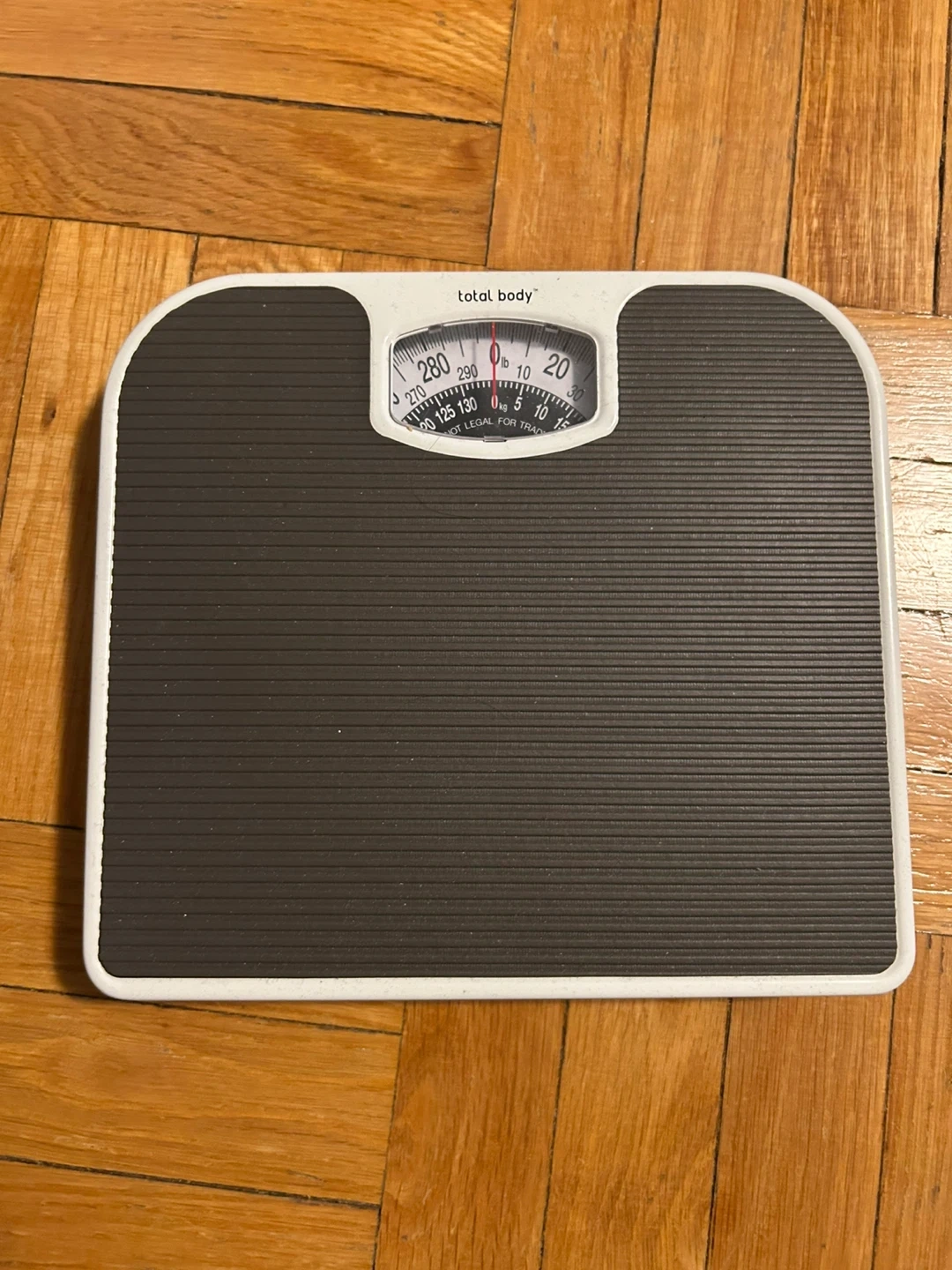 Total Body mechanical scale for weighing. It measures in pounds and kilograms. The scale has a dark grey textured surface with a white frame.