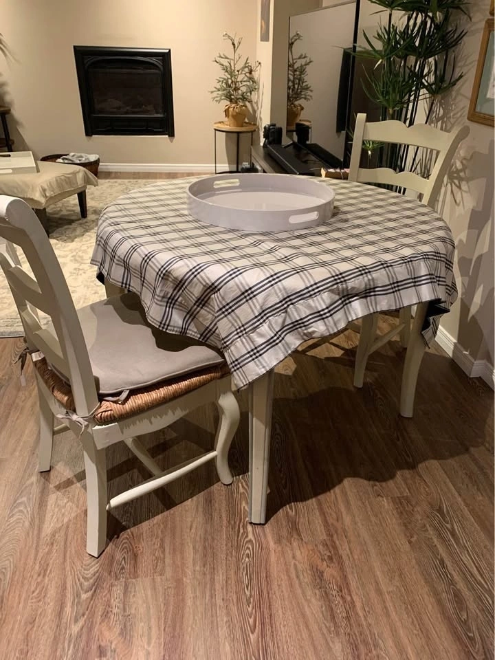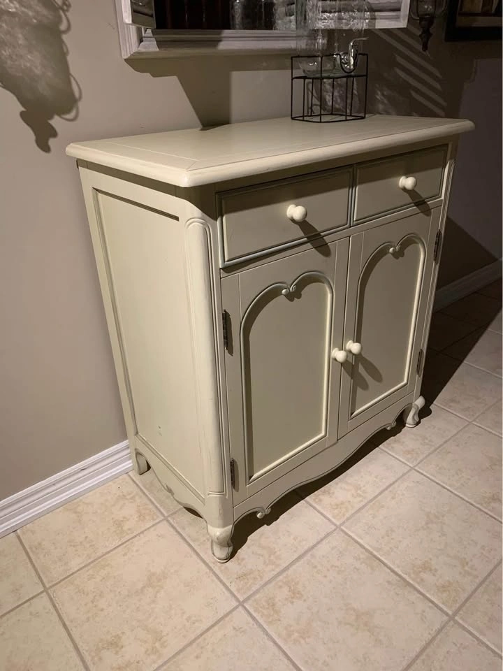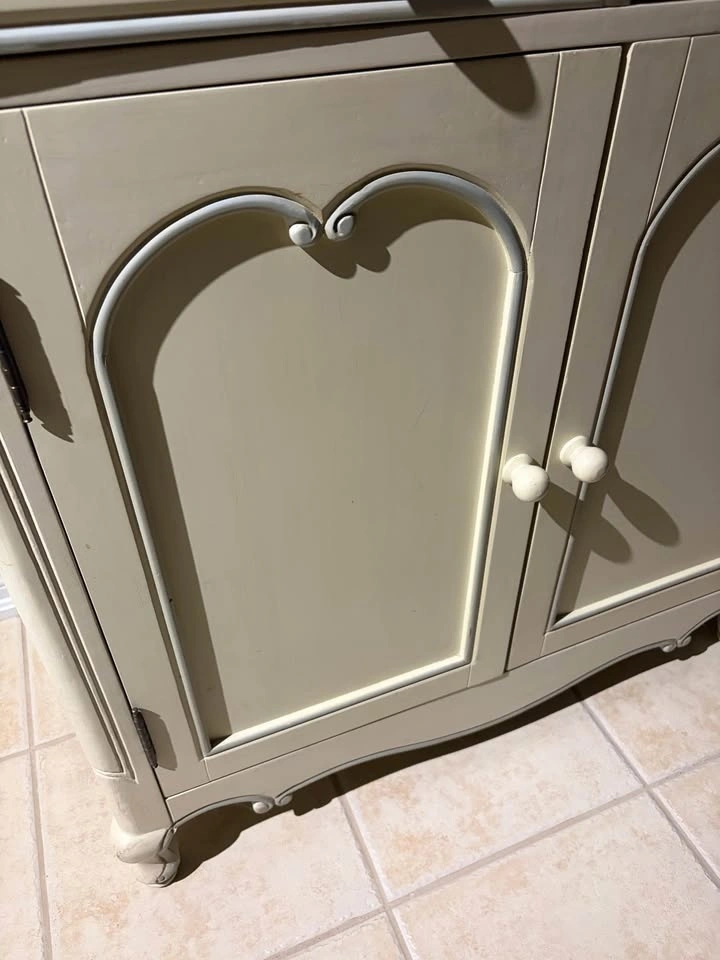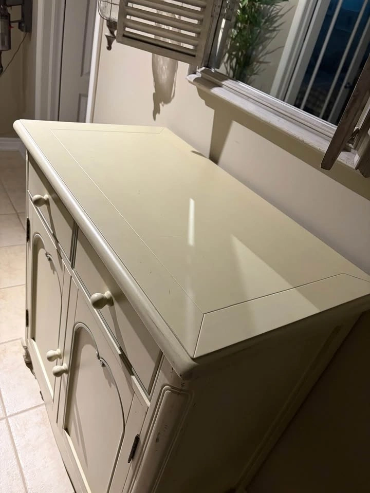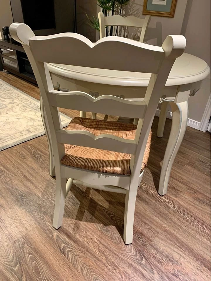 Gorgeous vintage dining set, professionally refurbished. Perfect for a kitchenette or condo. Cream color with beautiful details. Purchased new for $4500. The table is round, 42 inches in diameter. Chairs are solid wood with excellent quality rattan seats. Both table and chair seats were always covered, so they are in excellent condition with no scratches. This is a truly beautiful and unique set of superior quality and craftsmanship. Open to reasonable offers
