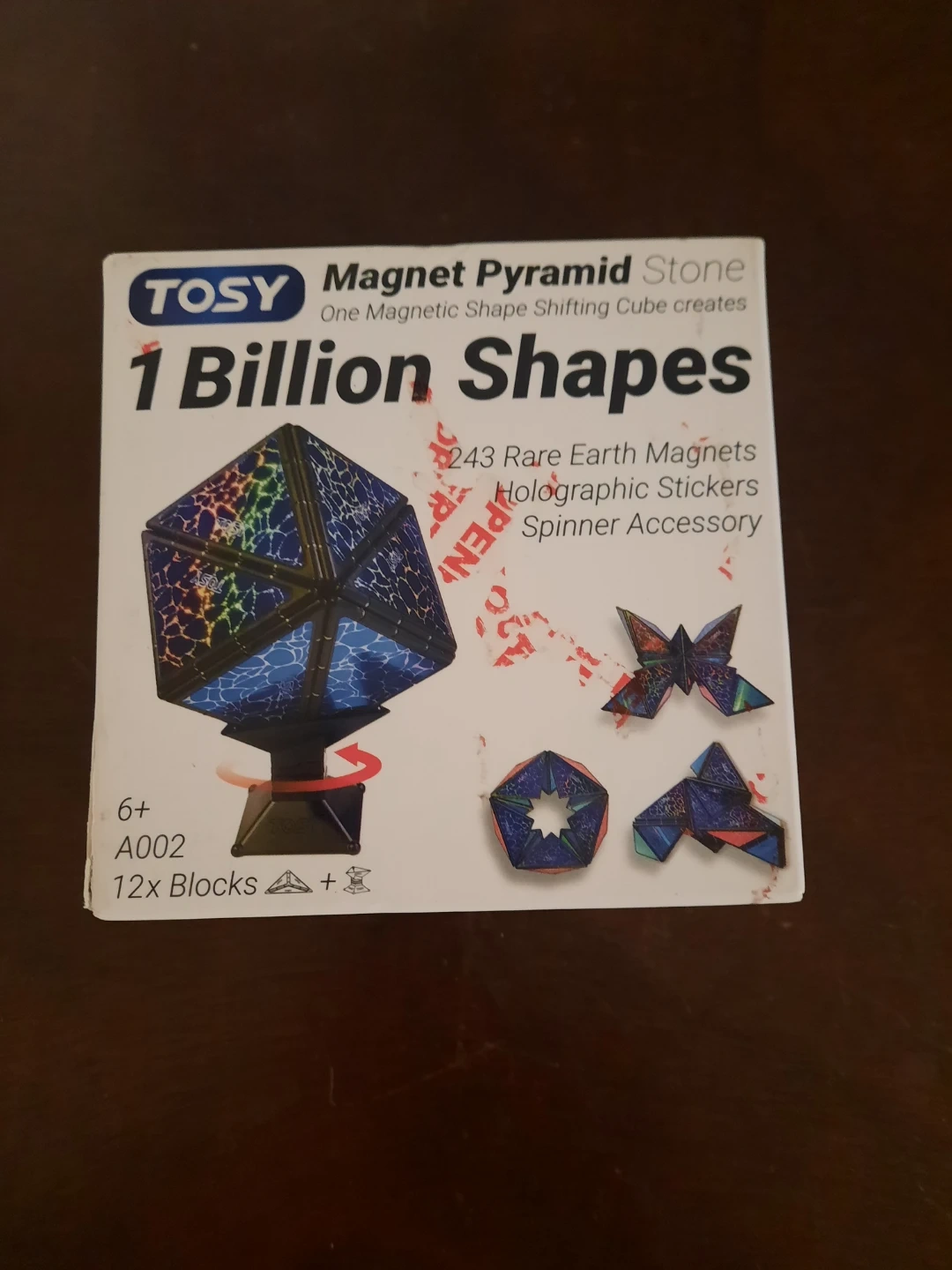 This TOSY Magnet Pyramid Stone allows for one magnetic shape-shifting cube to create 1 billion shapes. It's a spinner accessory with 243 rare earth magnets and holographic stickers. BOX IS OPEN. BUT CUBE IS BRAND NEW