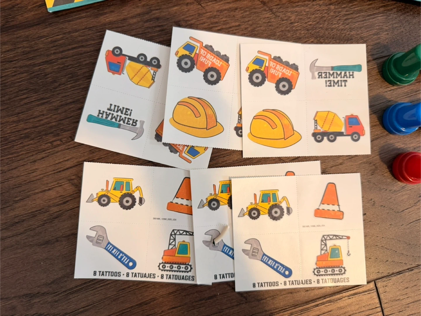 This set includes 6 construction-themed party favor bags with 'Loads of Fun!' printed on them. It also comes with 10 mini toys and assorted temporary tattoos featuring construction vehicles and hard hats. Perfect for a child's construction-themed birthday party!