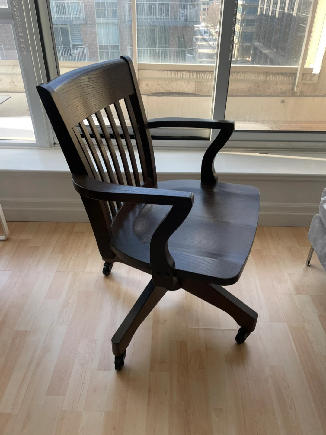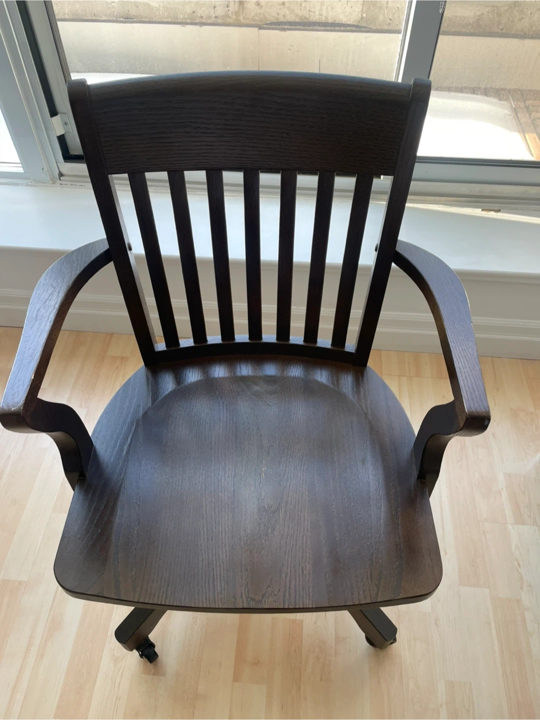 Solid oak stained dark. On casters with swivel and height adjustable features. With armrests and full backrest. Has a classic design.
