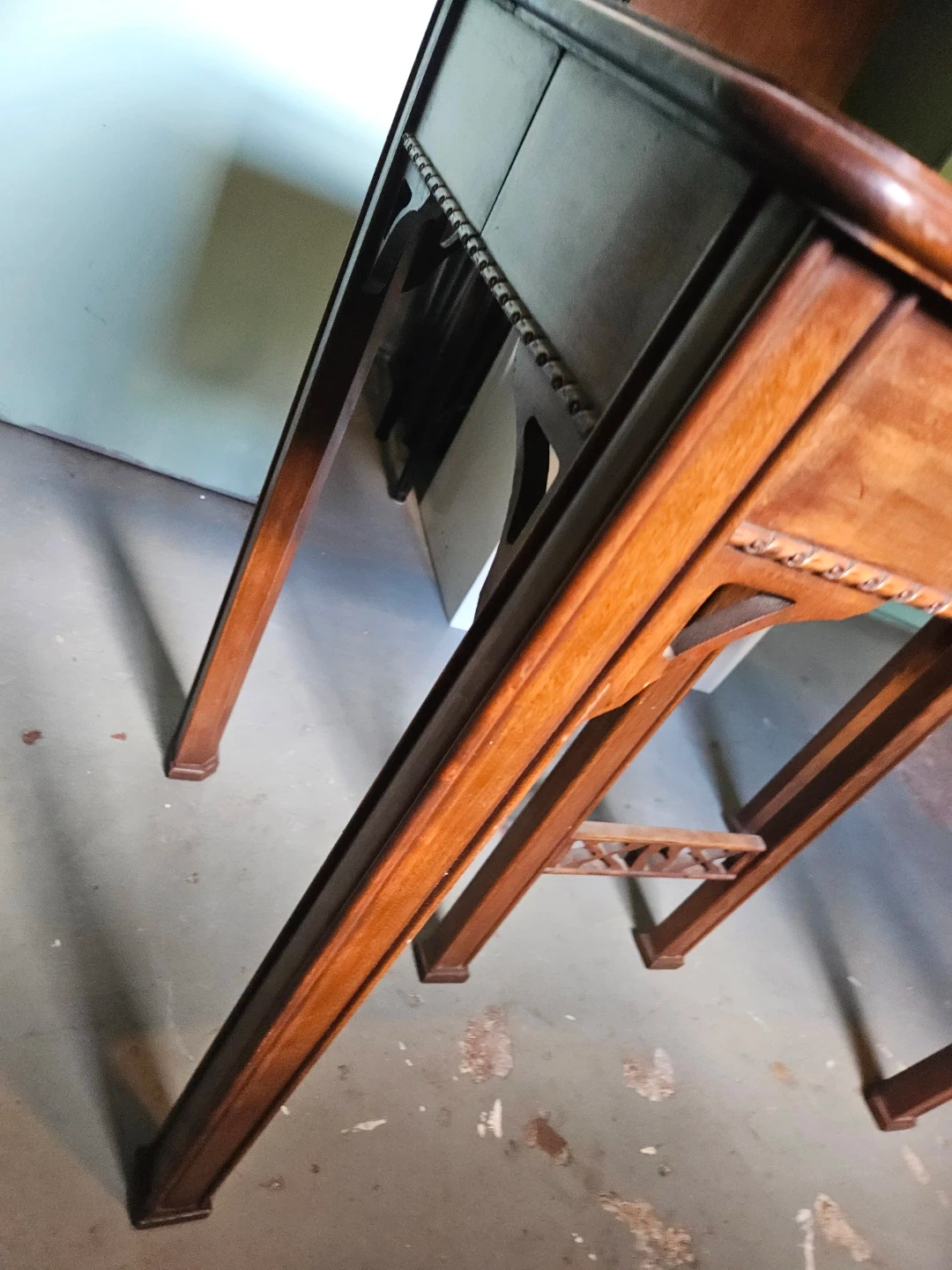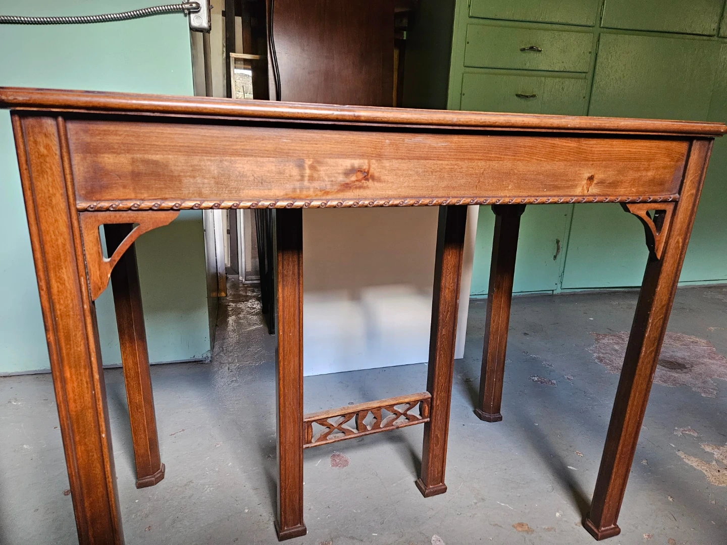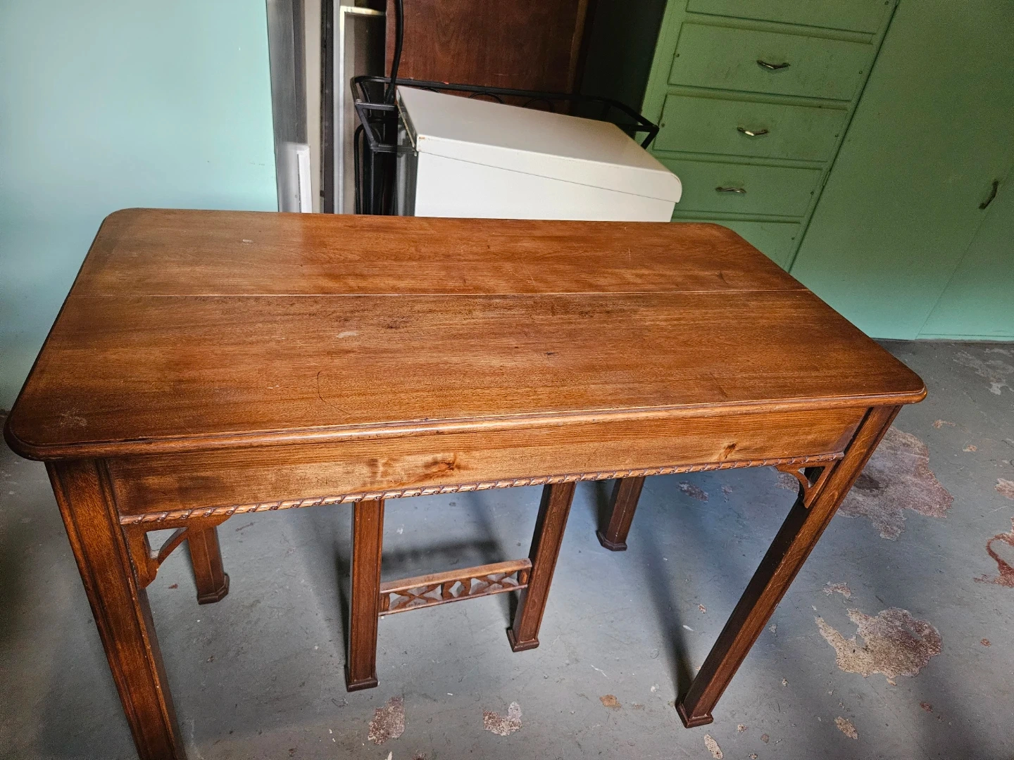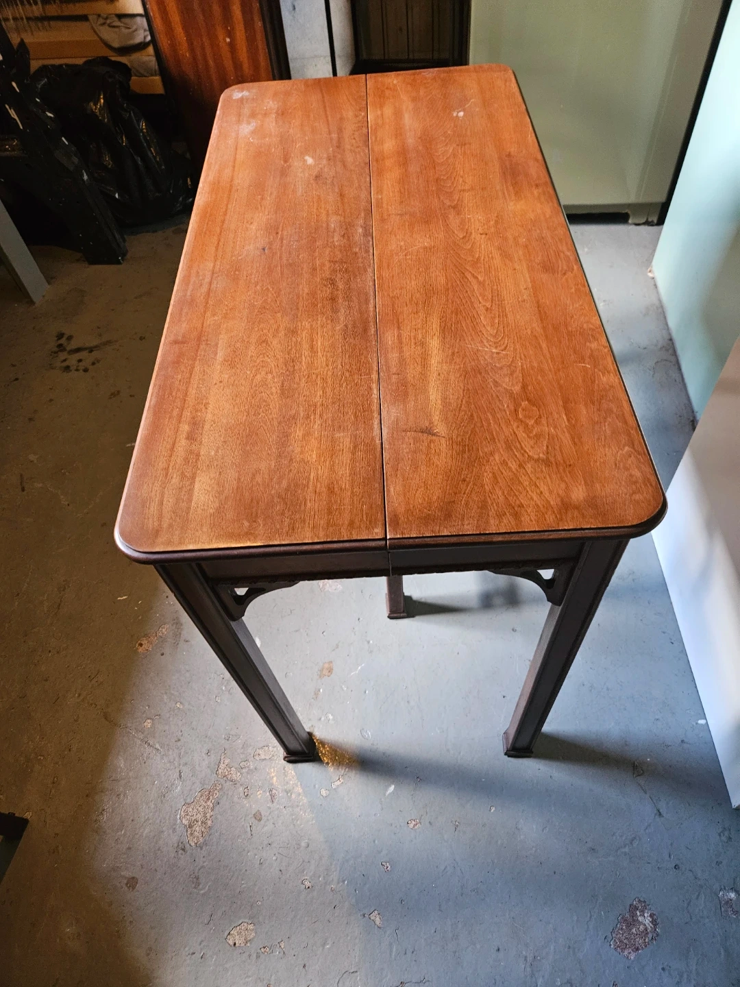 This is a vintage wooden table with a folding top. It's made of solid wood with decorative accents on the legs and apron. The surface shows some wear, consistent with its age. The table folds for easier storage and transport.