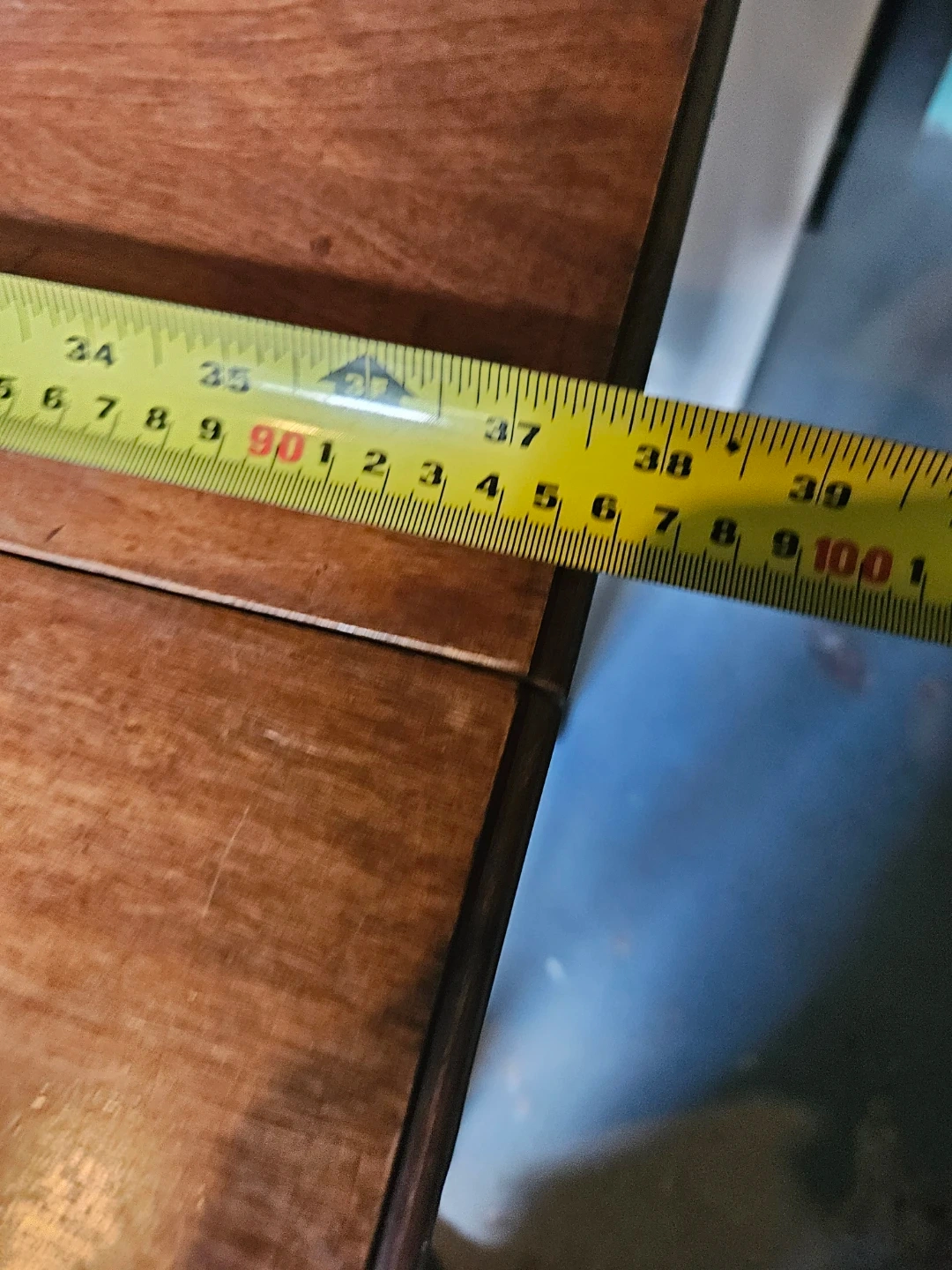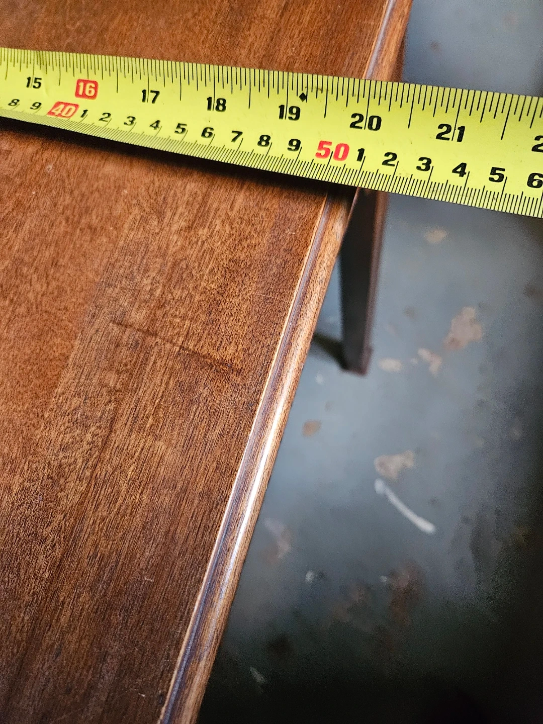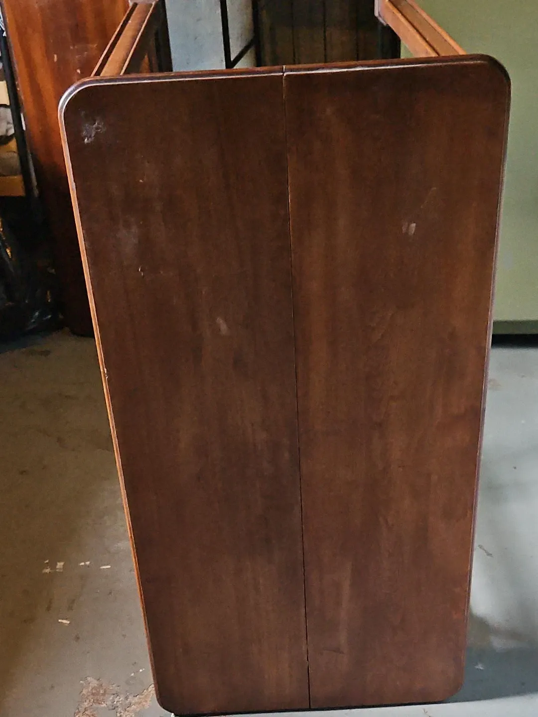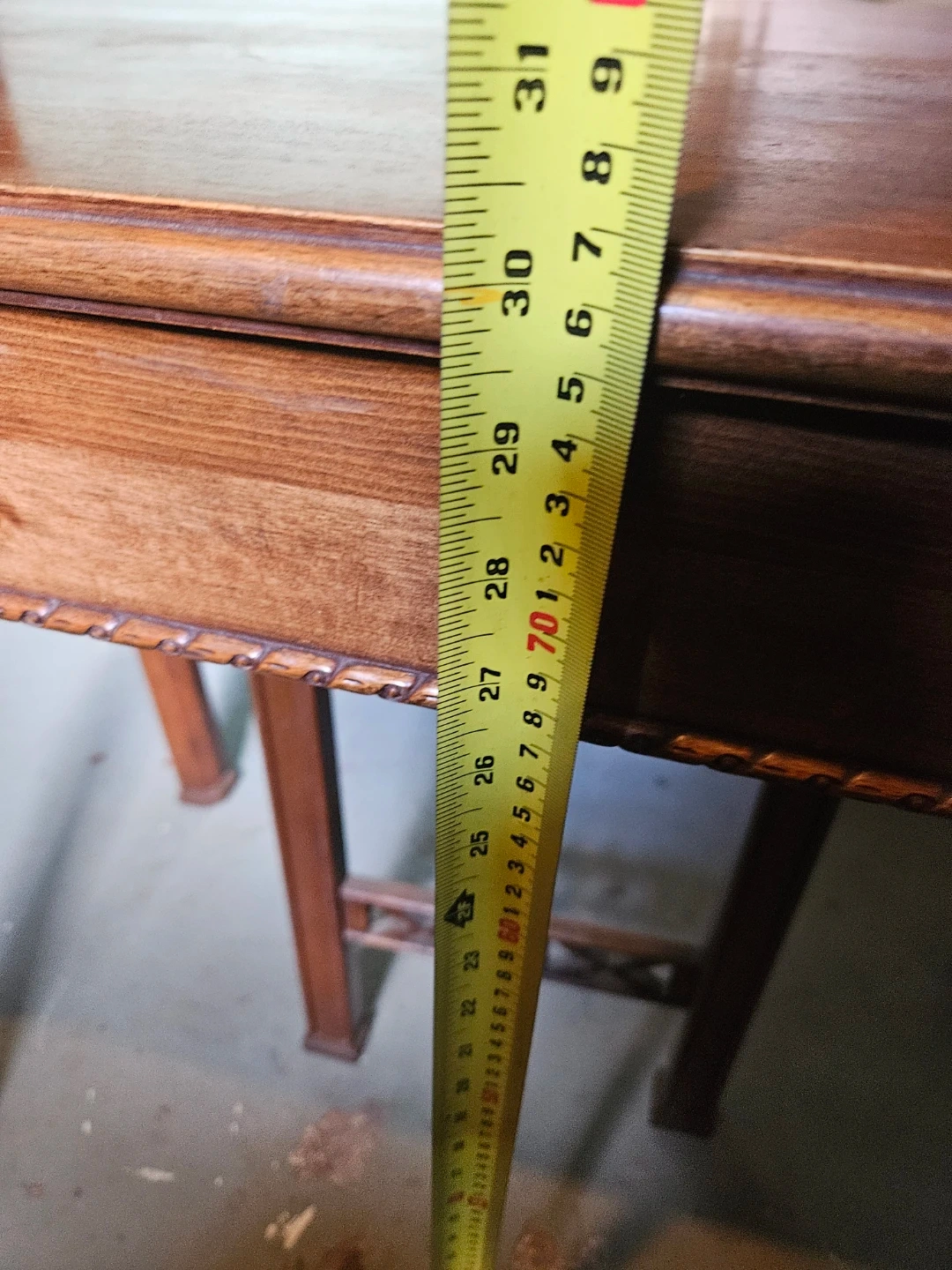 This is a vintage wooden table with a folding top. It's made of solid wood with decorative accents on the legs and apron. The surface shows some wear, consistent with its age. The table folds for easier storage and transport.