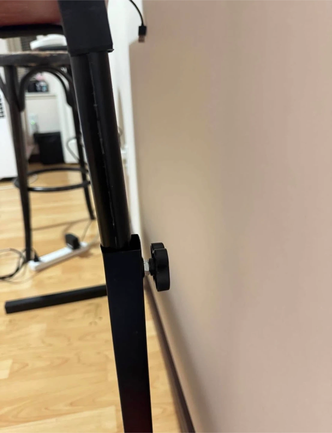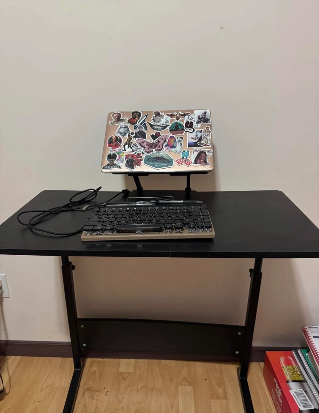 This is a black desk with an adjustable height feature - so you can turn it into a standing desk. It has a sturdy metal frame. suitable for a home office setup.