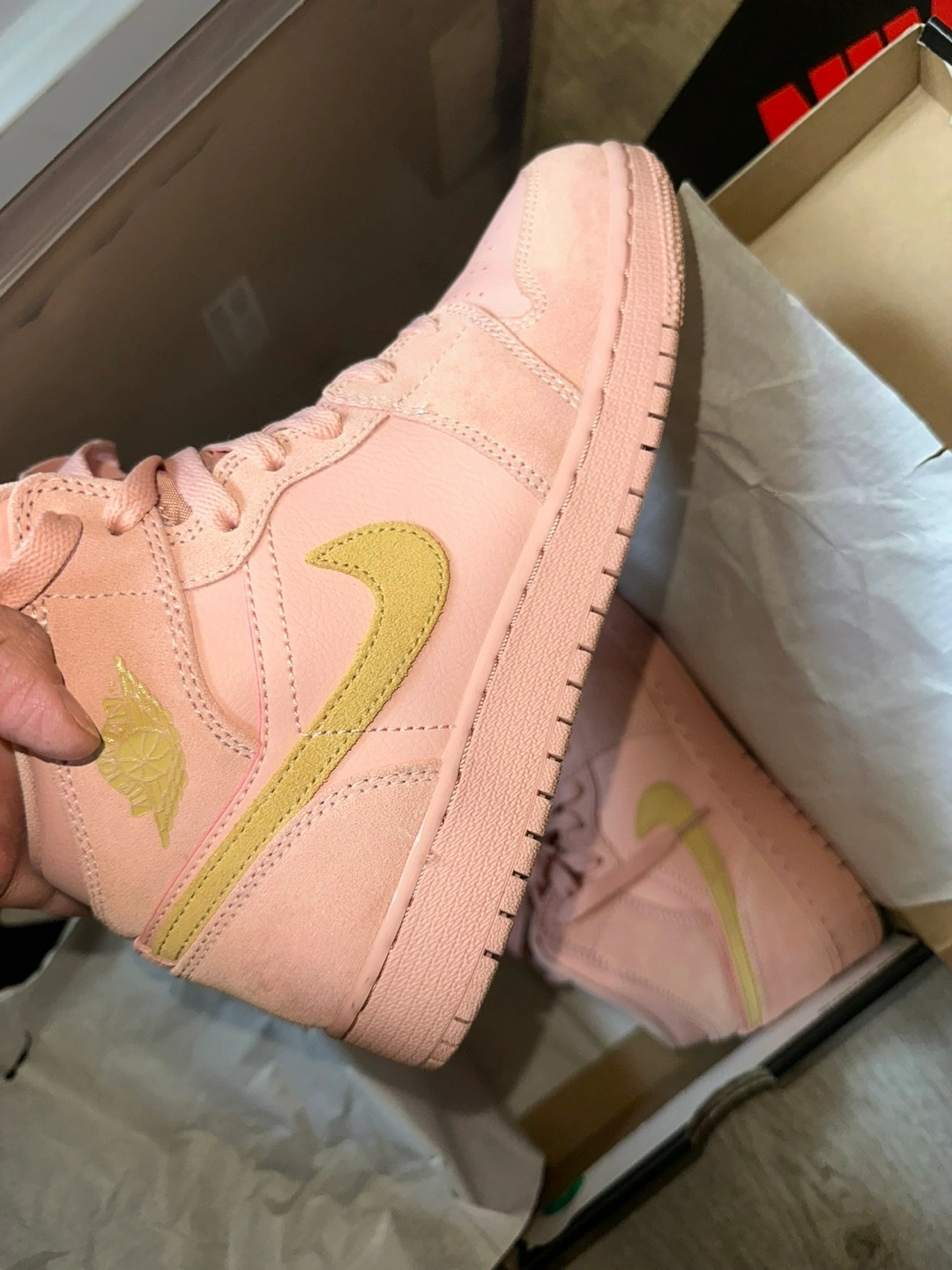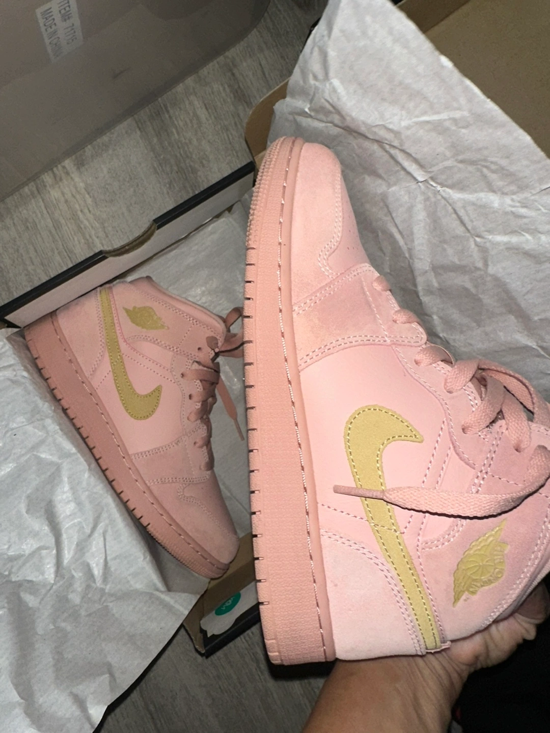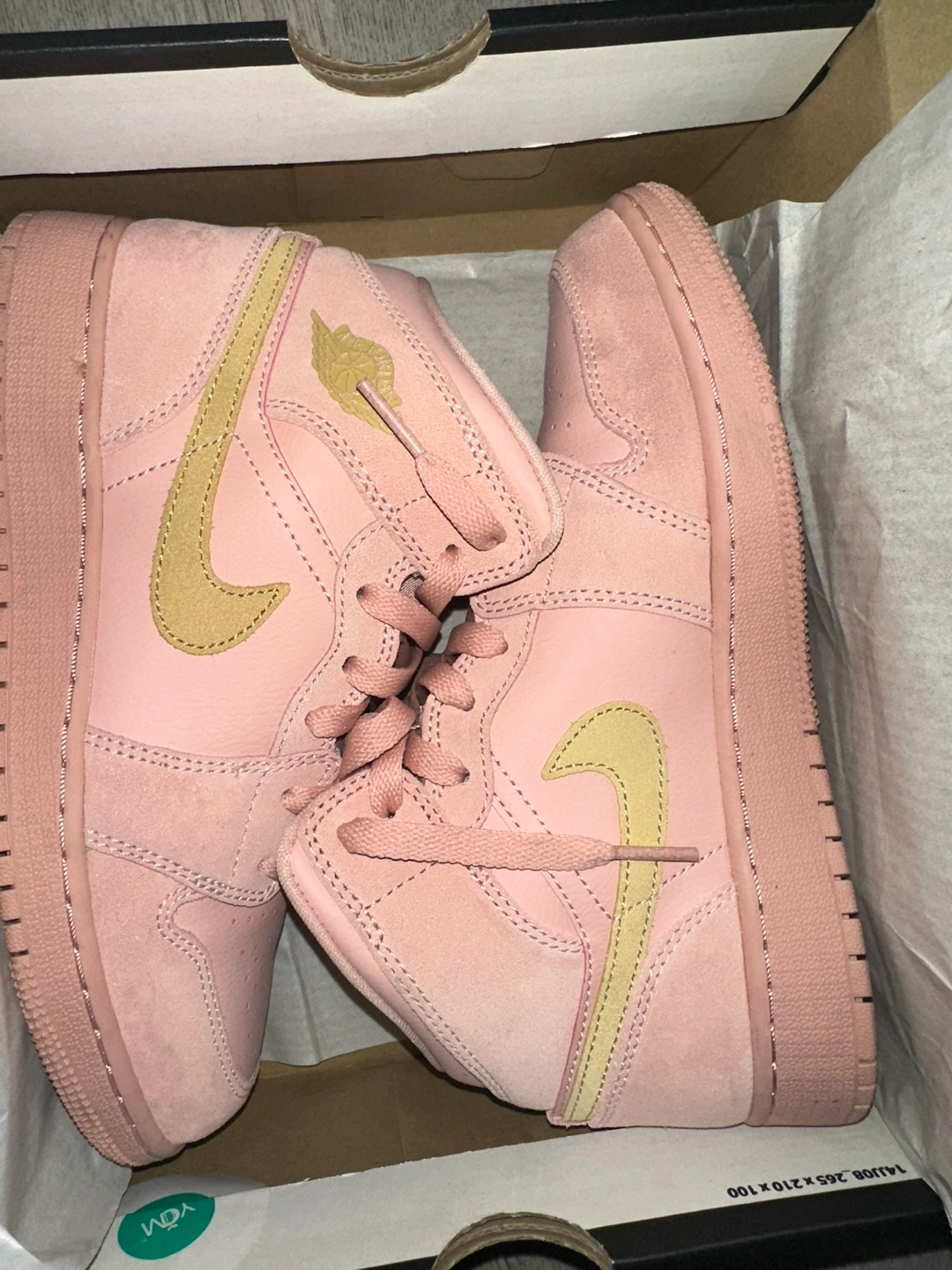 These Jordan 1 Mid sneakers come in a stylish pink colorway. They feature the iconic Jordan Wings logo and Nike Swoosh. Includes original box.