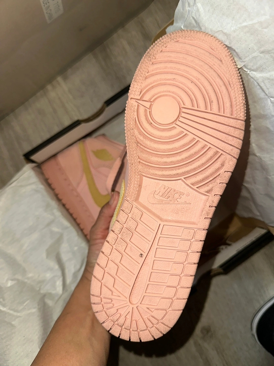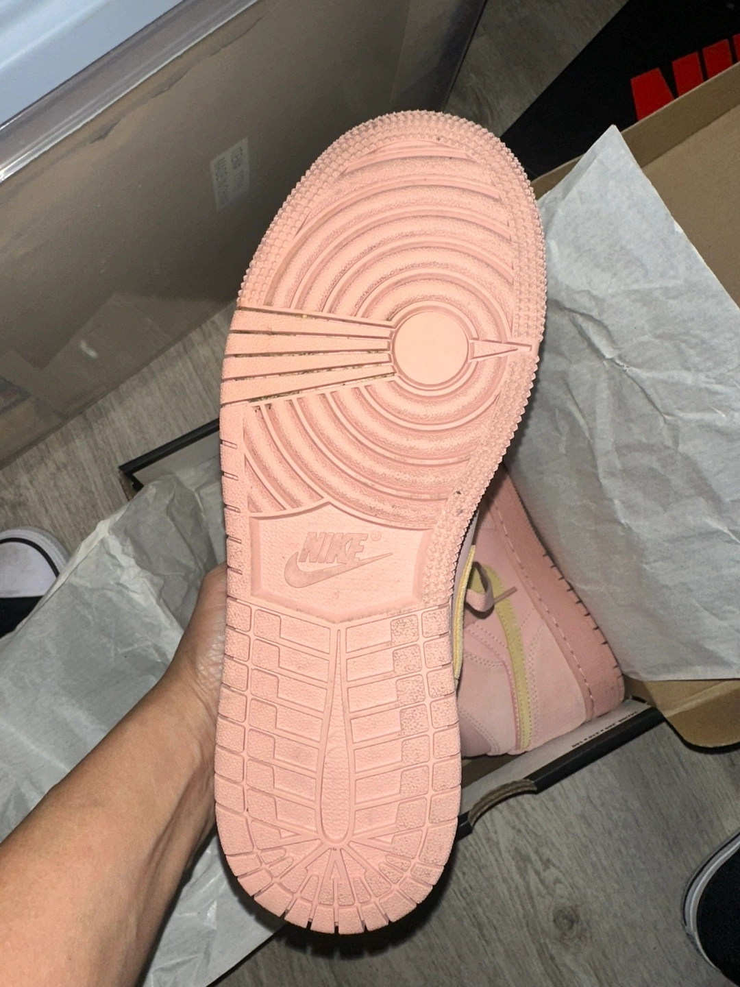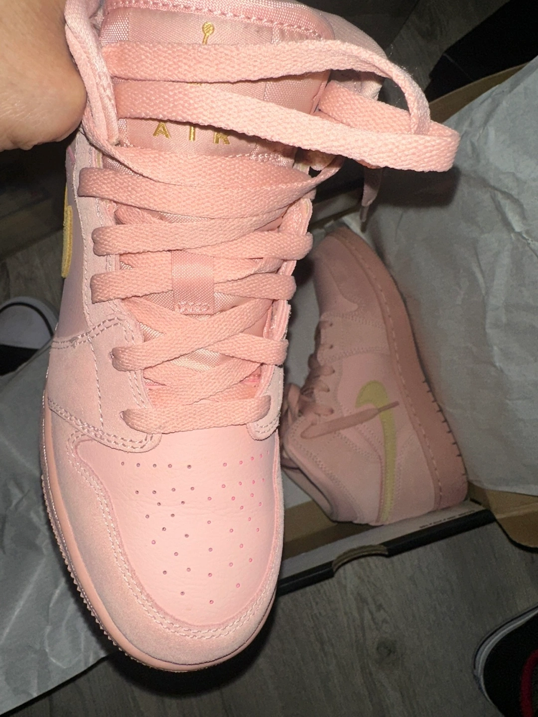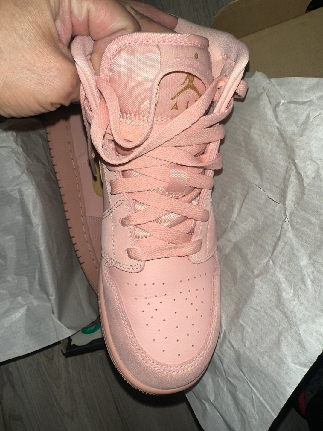 These Jordan 1 Mid sneakers come in a stylish pink colorway. They feature the iconic Jordan Wings logo and Nike Swoosh. Includes original box.
