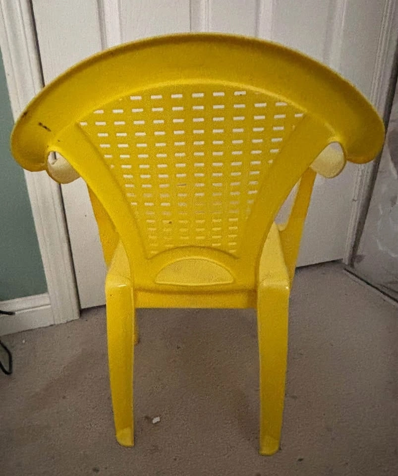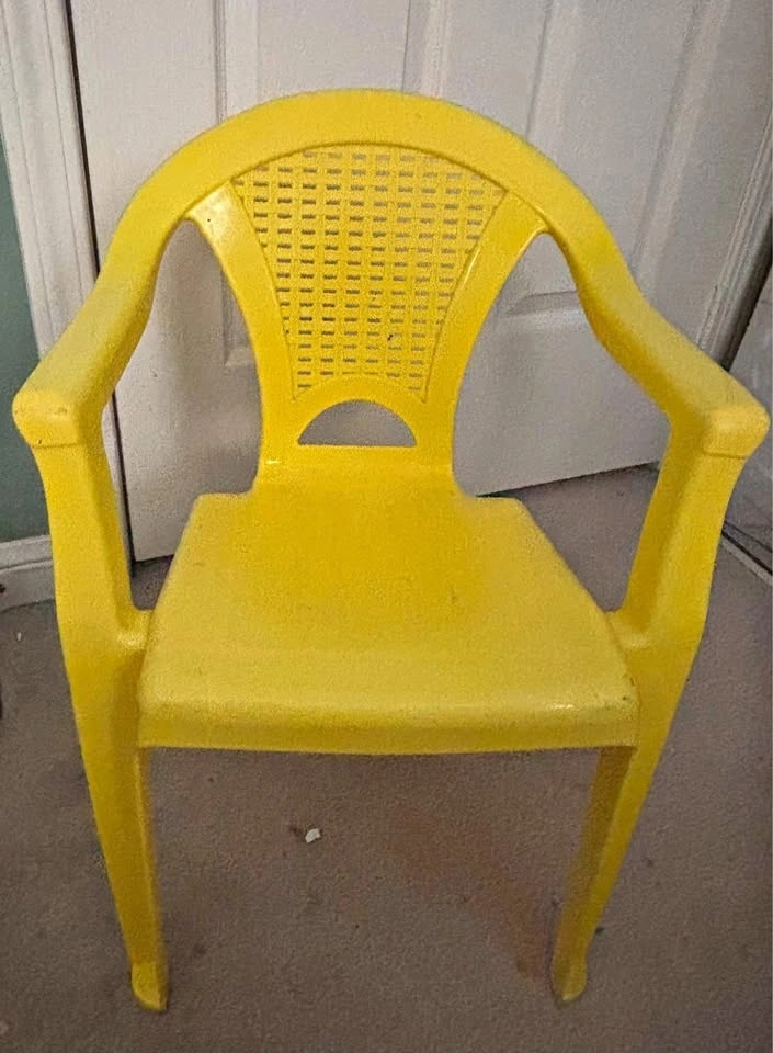 Small, yellow plastic chair with armrests and a slightly curved back. Seat is 10” x 10”. Located in Brampton near Fletchers Parkette.