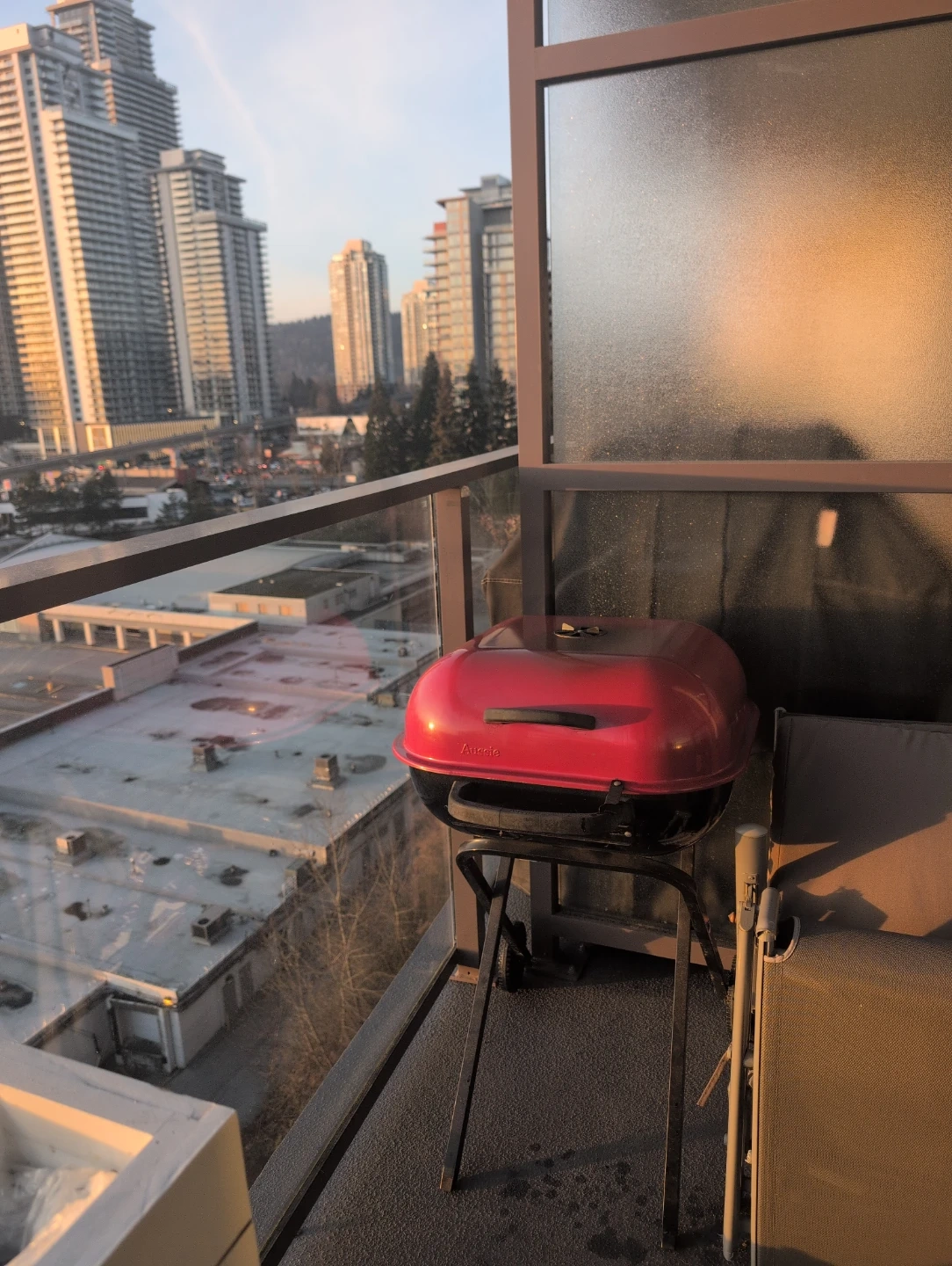 A compact red Aussie portable BBQ grill. Great for small patios or balconies. It's lightweight and easy to move. Includes a stand with wheels for convenient transport.