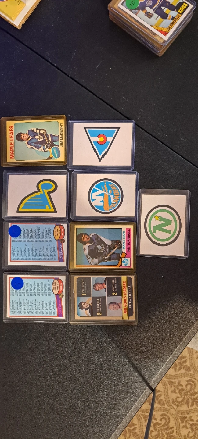 A collection of vintage hockey cards featuring various players and team logos. Many cards are in protective sleeves. Includes NHL stats and team affiliations.