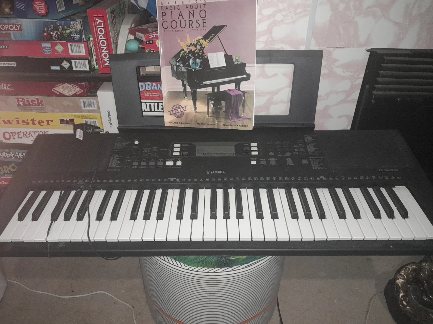 Yamaha PSR-E363 portable electronic keyboard. Comes with a music stand and Alfred's Basic Adult Piano Course book. It's a great starter keyboard for learning to play!