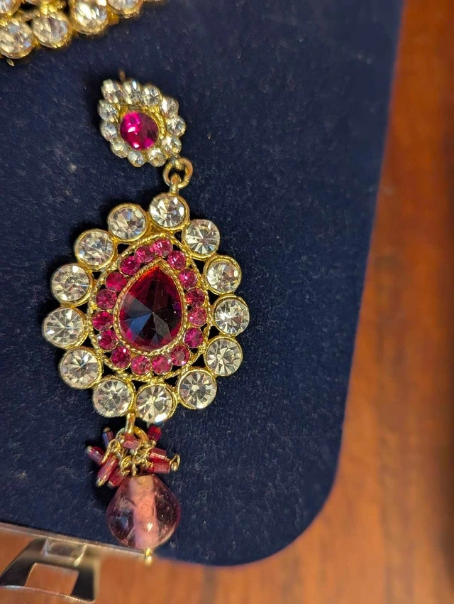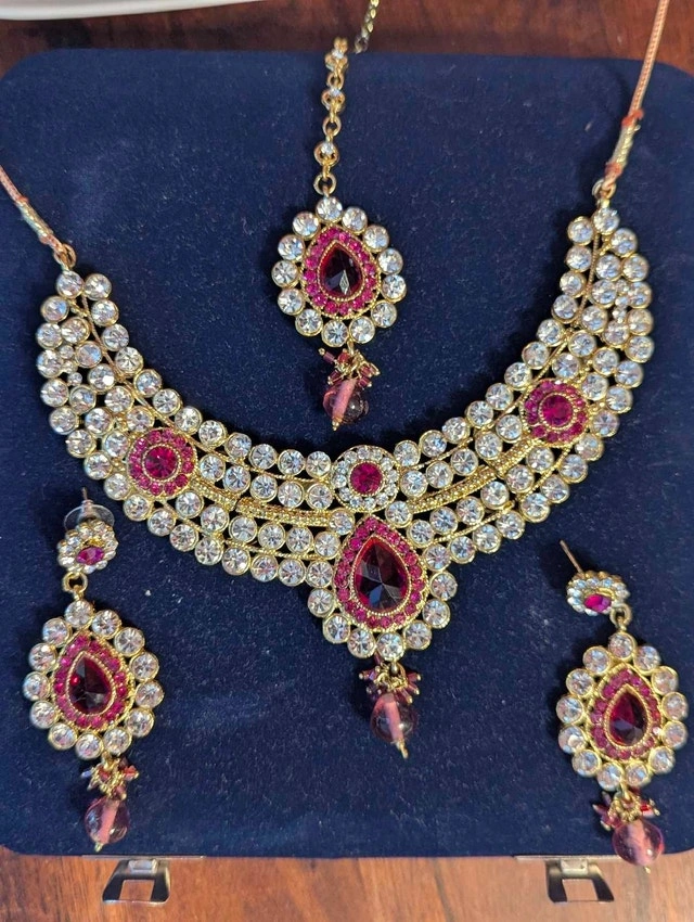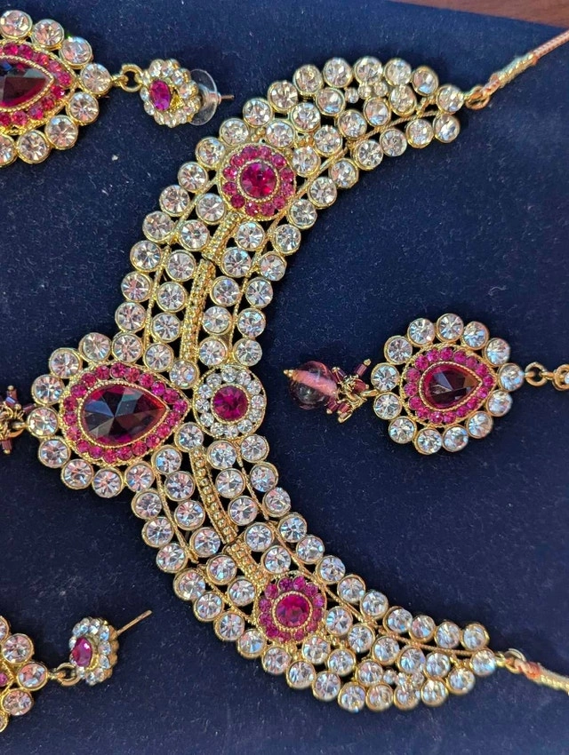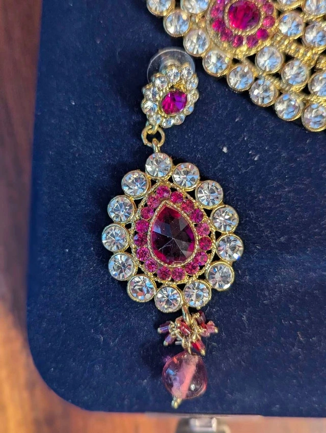 This is a stunning, used jewellery set that includes a necklace, matching earrings, and a headpiece, perfect for adding a touch of elegance to any special occasion. The set features intricate detailing with faux gemstones and gold-tone accents. The set is in good condition, with minor signs of wear that do not detract from its overall beauty. Material: Faux gemstones, gold-tone metal. Includes: Necklace, earrings, headpiece.