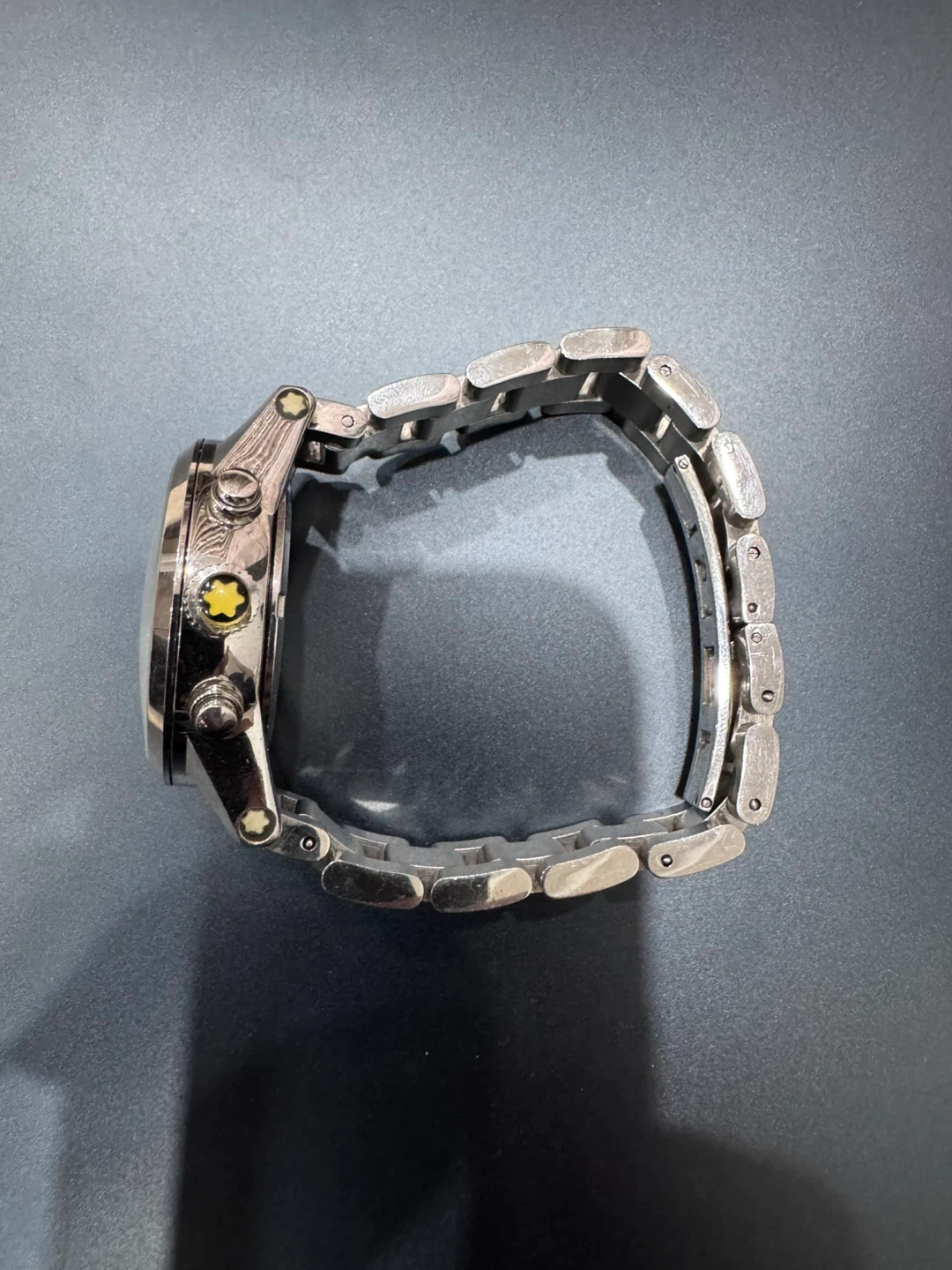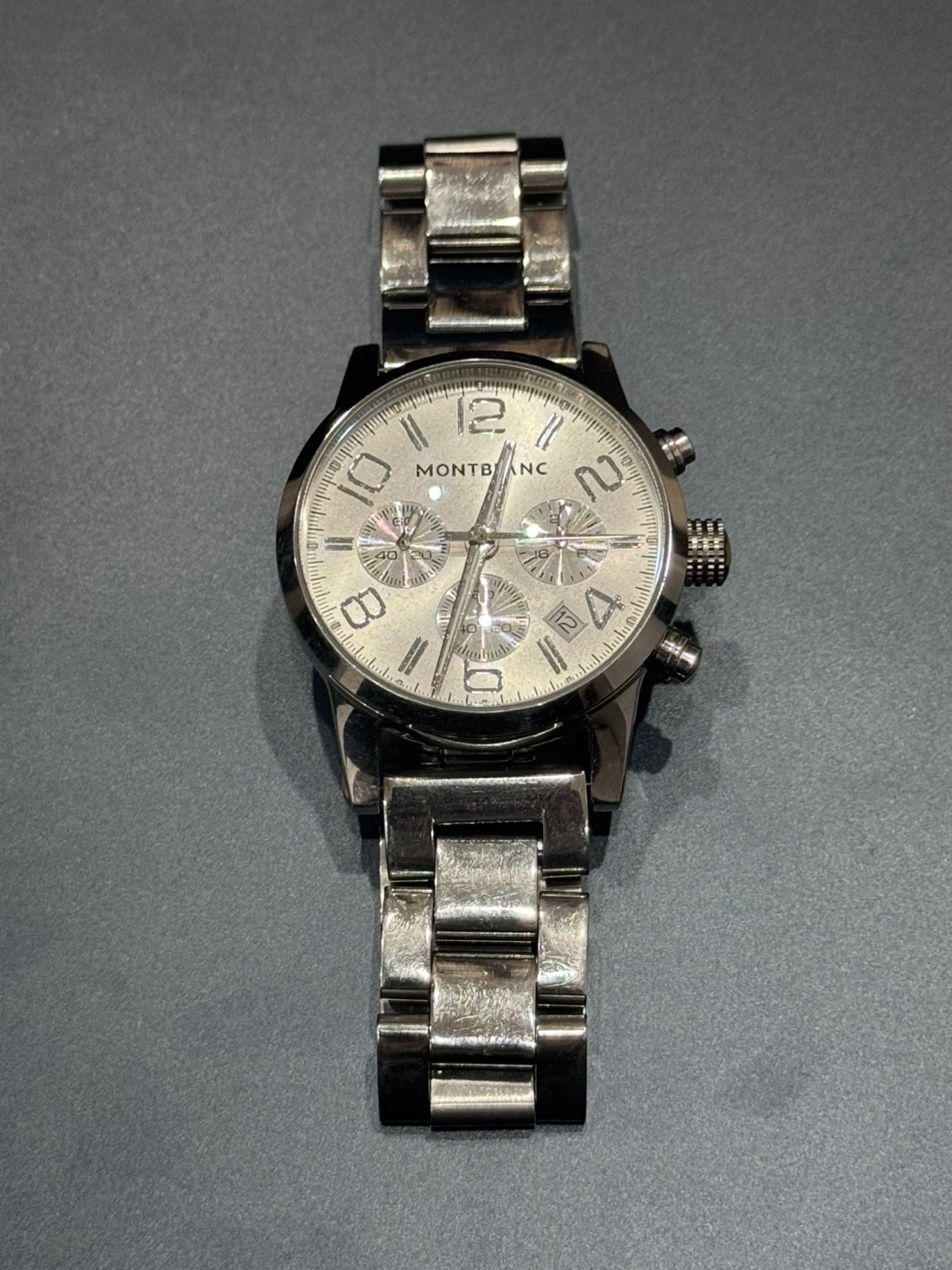 This is a Montblanc chronograph watch with a stainless steel band and case. It features multiple sub-dials and a date display. The watch is in good condition and ready for a new owner. Box is not included