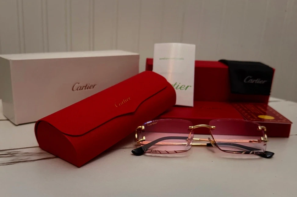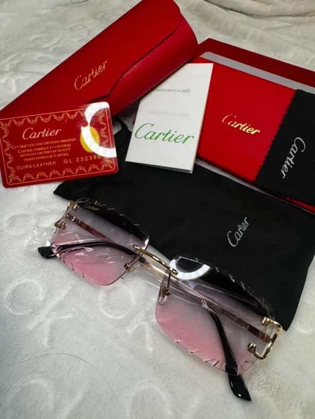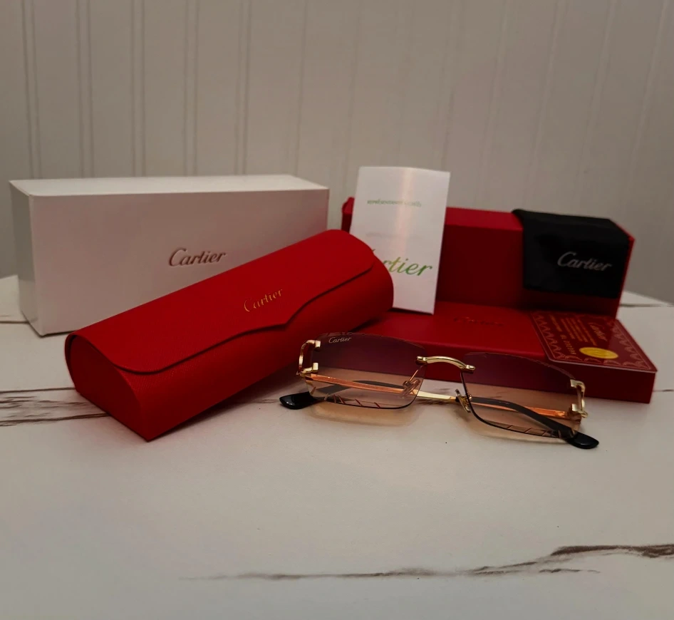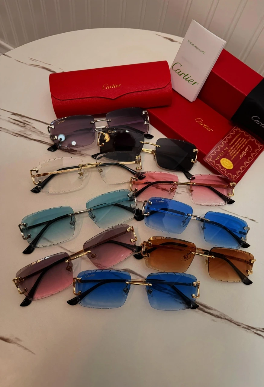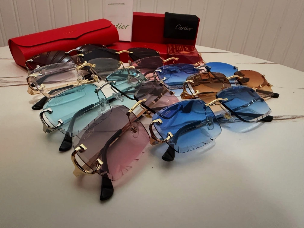 A collection of Cartier rimless sunglasses with assorted gradient lenses. Each pair comes with its original box, case, and cleaning cloth. These are perfect for adding a touch of luxury to any outfit.