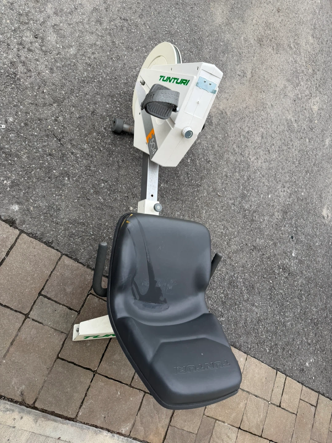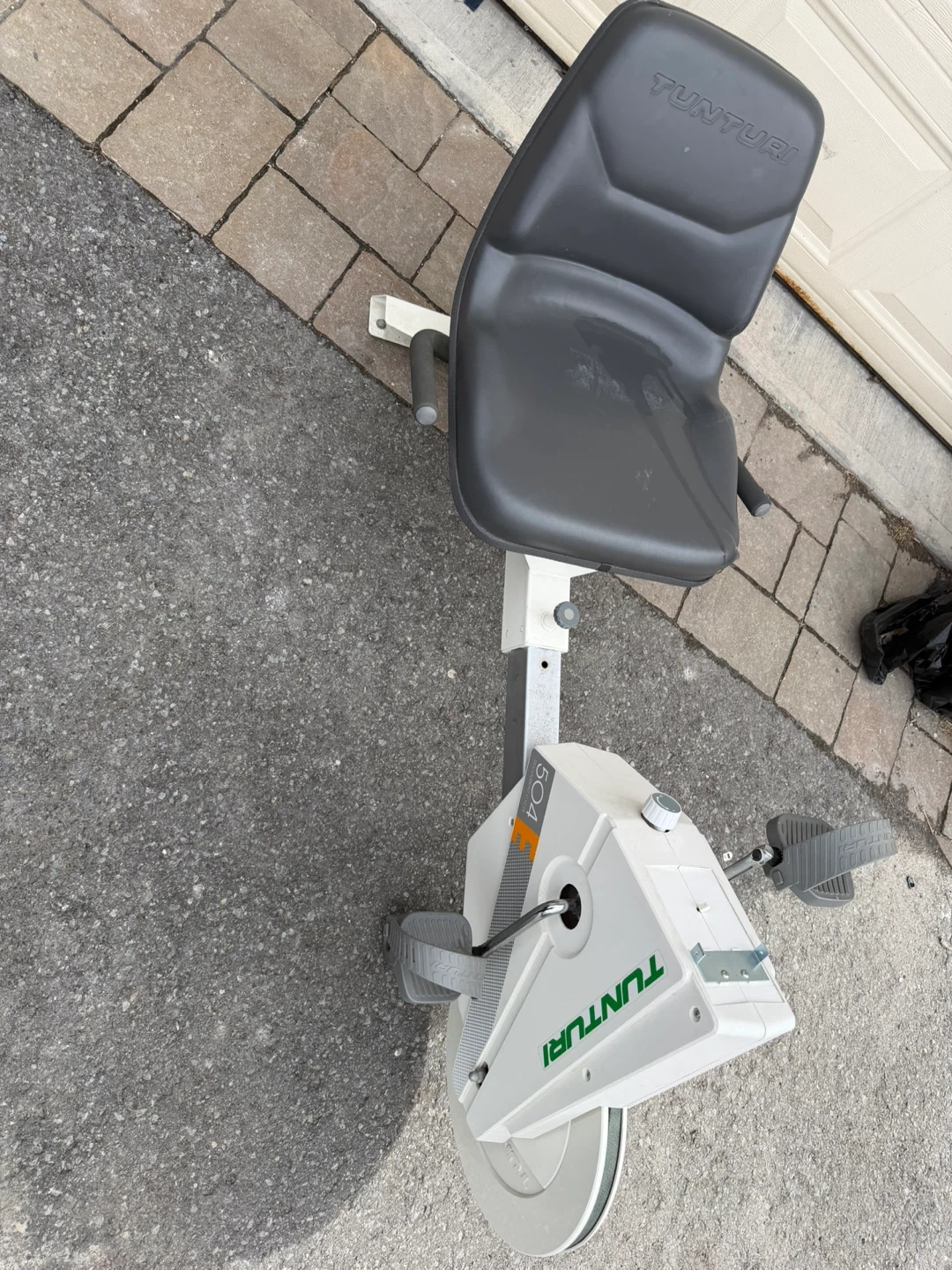 A Tunturi 504 recumbent exercise bike with a comfortable seat. It features adjustable pedals for your workout. This bike's design makes it easy to get on and off!